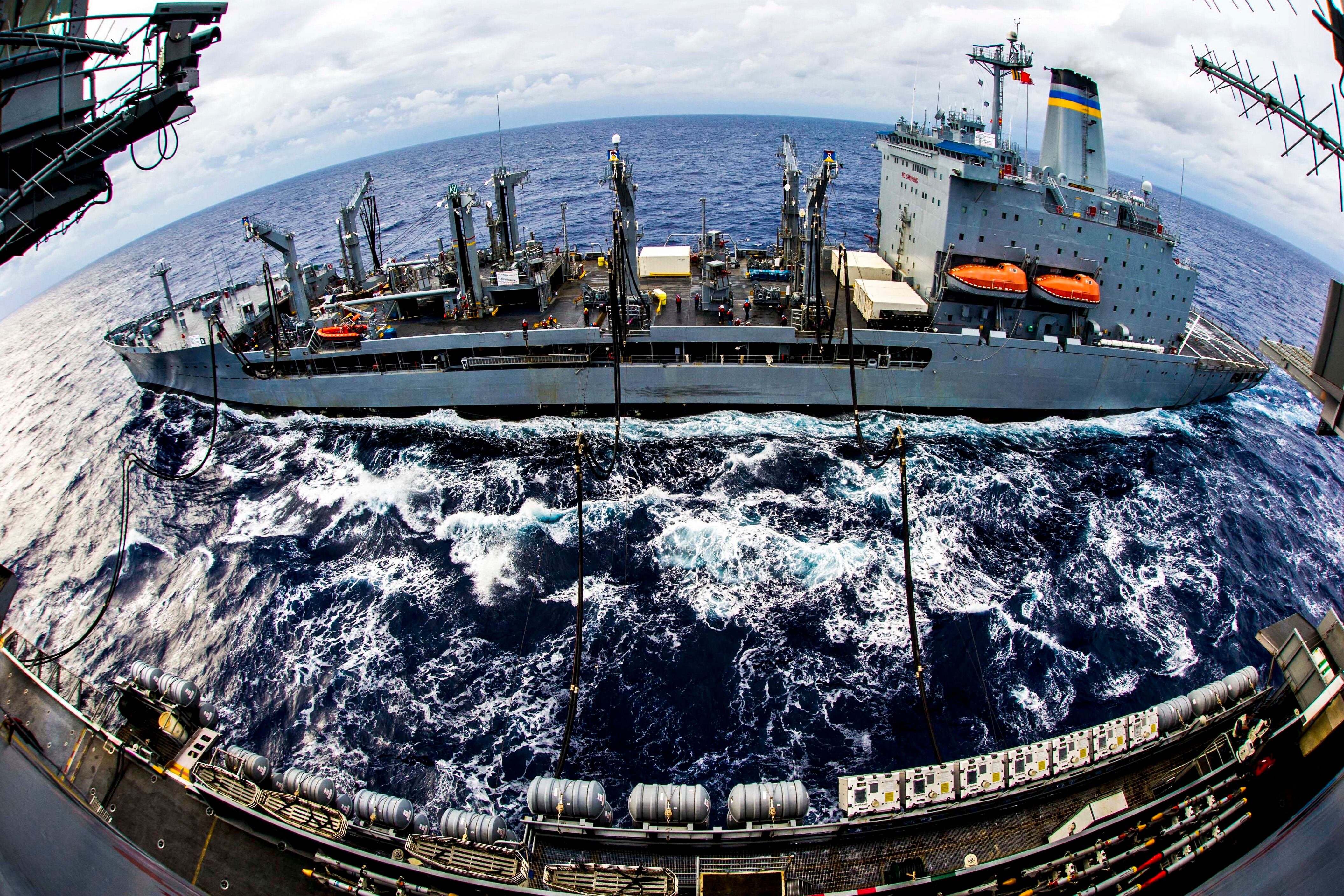U.S. Air National Guard photo by Maj. Dale Greer The Military Sealift Command fleet replenishment oiler USNS John Ericsson sails next to the aircraft carrier USS George Washington during a replenishment at sea, Oct. 19, 2014. The ship and its embarked air wing, Carrier Air Wing 5, provide a combat-ready force that protects and defends the collective maritime interests of the U.S. and its allies and partners in the Indo-Asia-Pacific region.