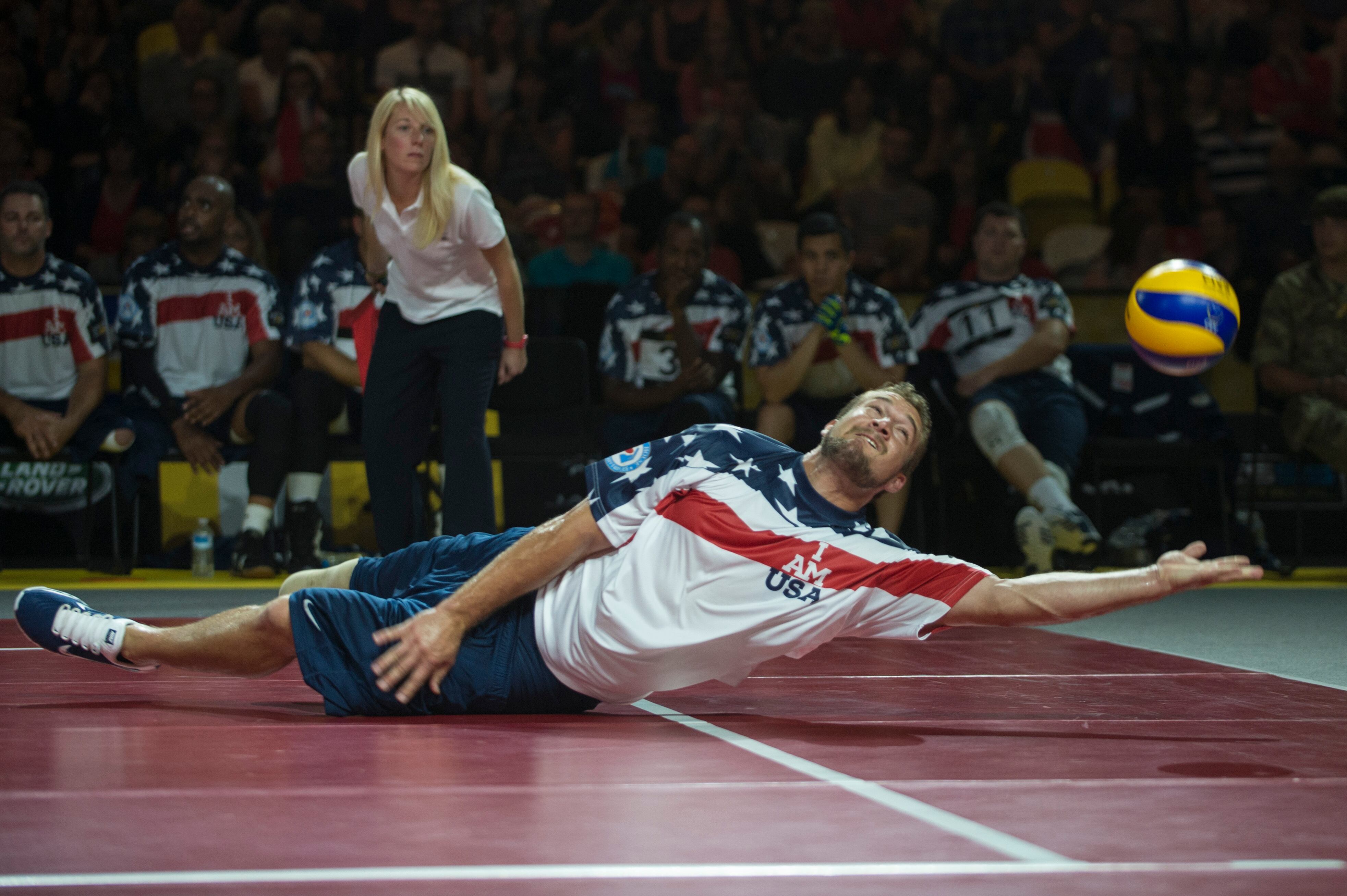 U.S. Navy Hospital Corpsman 2nd Class Max Rohn reaches for the ball as the United States team goes up against the United Kingdom at the sitting volleyball finals in the Invictus Games. The U.K. defeated the U.S. in a best-out-of-five match. Over 400 competitors from 13 nations took part in the Invictus Games, an international sporting event for wounded, injured and sick service members. (U.S. Navy photo by Mass Communication Specialist 1st Class (SW) Mark Logico/RELEASED)