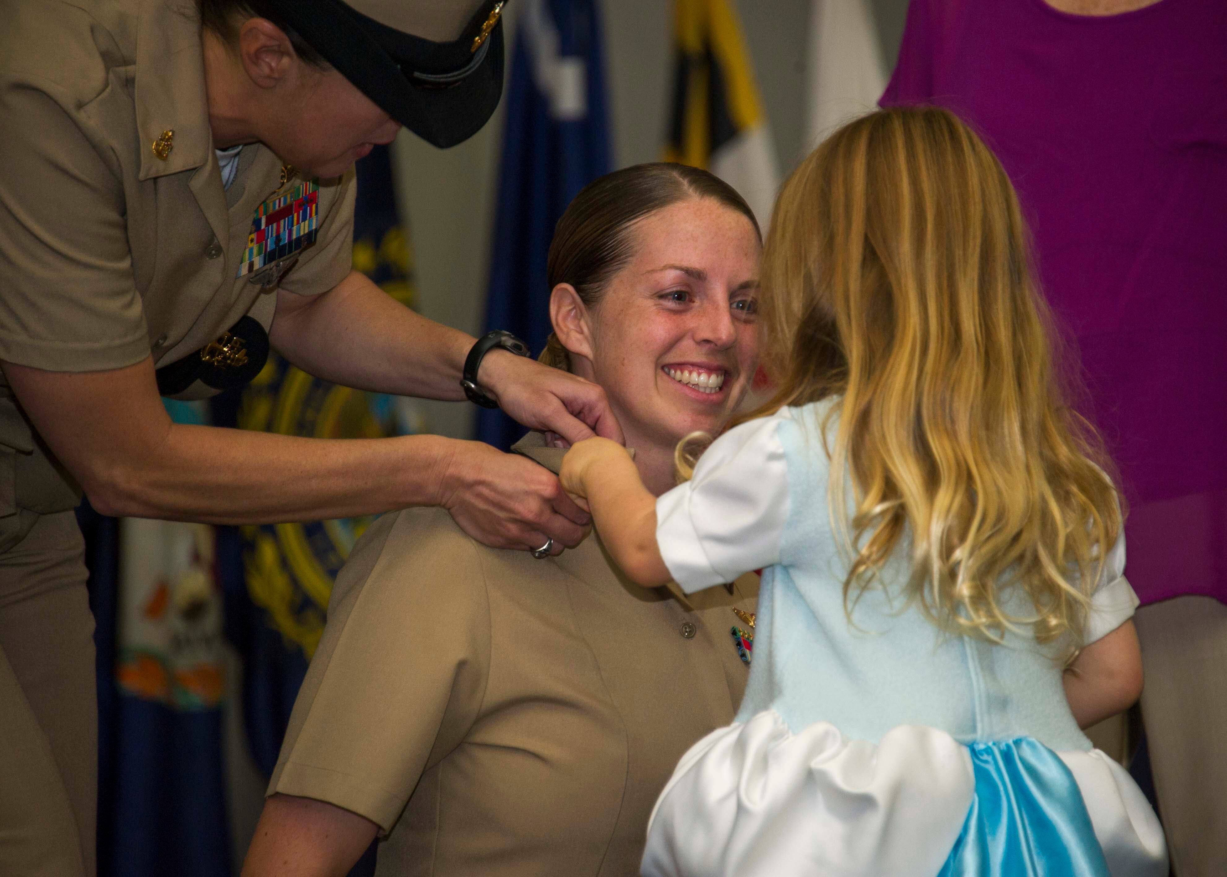 Chief Naval Aircrewman (Mechanical) Melissa Stone, of Commander, Fleet Air Forward, has her anchors pinned on by her daughter during a chief pinning ceremony at Naval Air Facility Atsugi's Cinema 77. A total of 12 chiefs from NAF Atsugi and its tenant commands received their anchors and combination covers during the ceremony. (U.S. Navy photo by Mass Communication Specialist 2nd Class Kegan E. Kay/Released)
