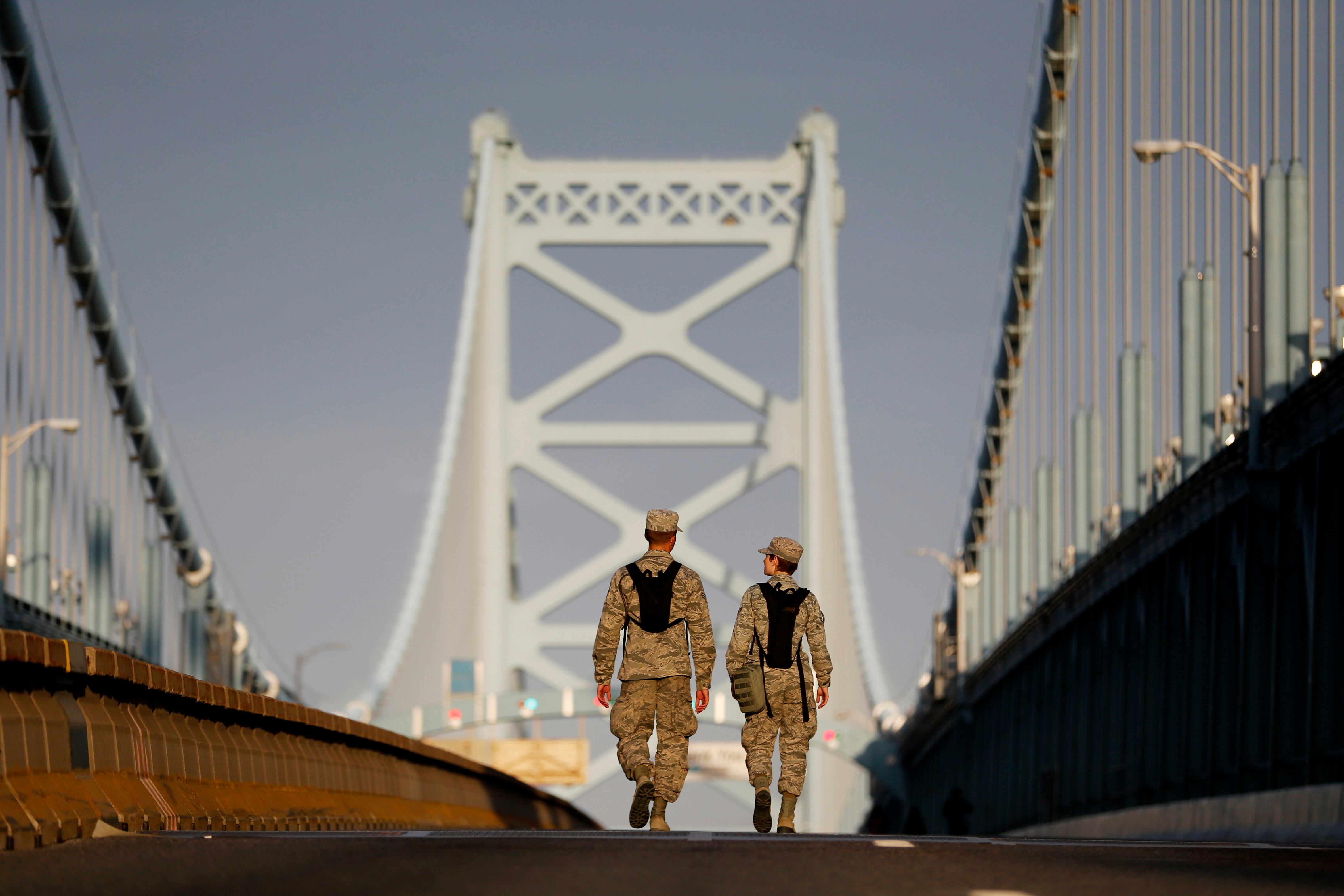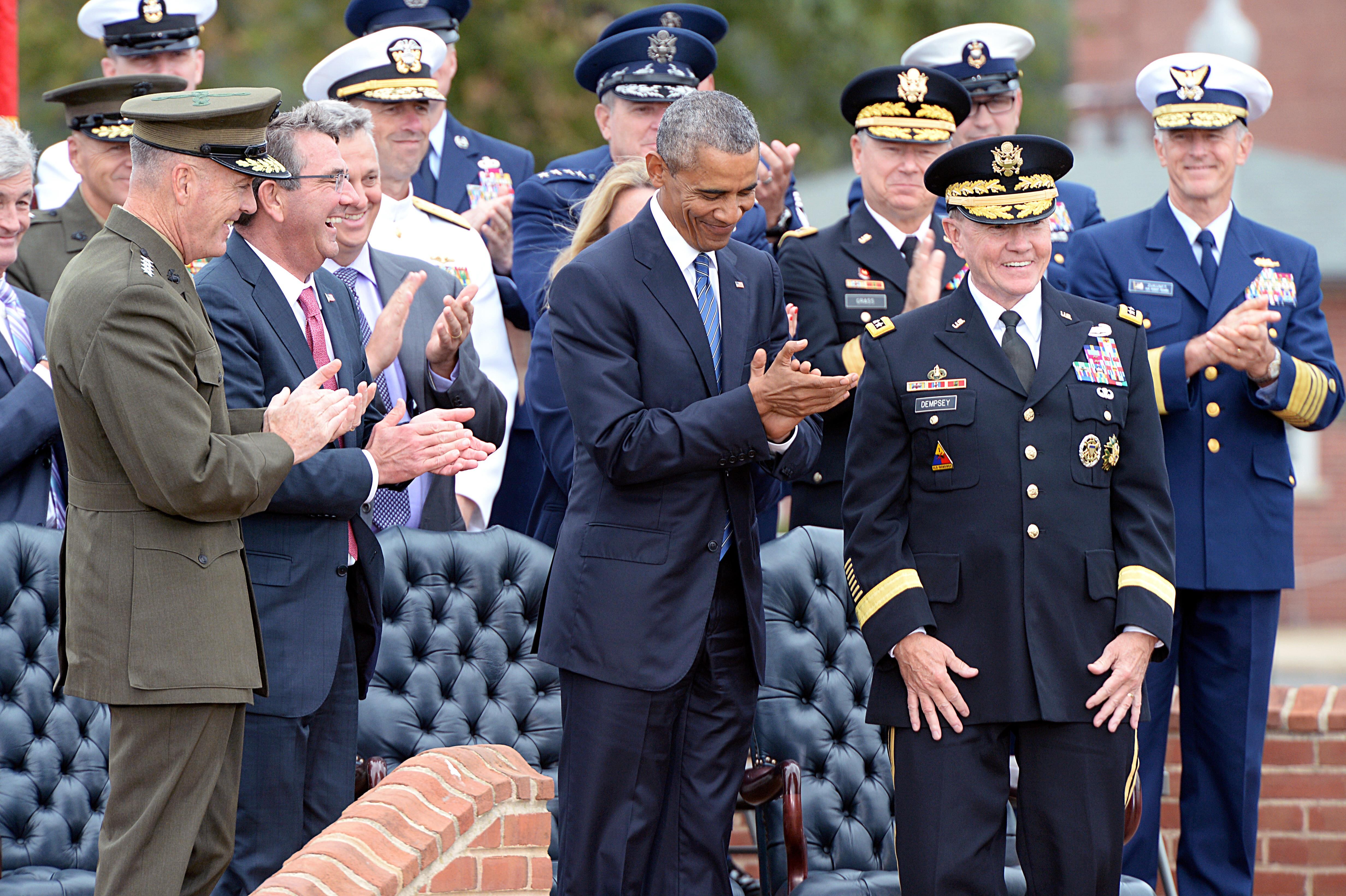 President Barack Obama, Secretary of Defense Ash Carter and Marine Gen. Joseph F. Dunford Jr., the new chairman, applaud outgoing Chairman of the Joint Chiefs of Staff Army Gen. Martin E. Dempsey during the change of responsibility ceremony at Summerall Field, Joint Base Myer-Henderson Hall, Arlington, Va., Sept. 25, 2015. DoD photo by U.S. Army Sgt. 1st Class Clydell Kinchen New Jersey Air Force National Guard members Jake Kaiser, left, of Freehold, N.J., and Nicole Marcus, of Mount Laurel, N.J., patrol the Benjamin Franklin Bridge, Sunday, Sept. 27, 2015, in Philadelphia. The bridge was shut down to vehicular traffic over the weekend during the Pope Francis' visit to the city. (AP Photo/Julio Cortez)Soldiers from the 82nd Airborne Division jump from a C-17 aircraft as part of the U.S. militaryÕs Network Integration Evaluation at White Sands Missile RangeÕs Space Harbor, Sunday, Sept. 27, 2015 in New Mexico. Approximately 600 jumped from 1,000 feet to to confront about 200 soldiers on the ground acting as enemy combatants. (Jett Loe/The Las Cruces Sun-News via AP) MANDATORY CREDIT Marines from Battery B, 1st Battalion, 11th Marine Regiment, fire rounds down range in support of Supporting Arms Coordination Center Exercise on San Clemente Island, Calif., Sept. 25, 2015.The exercise is the first the Marines and Sailors will work together at sea as they prepare for deployment to the Pacific and Central Command areas of responsibility in early 2016. (U.S. Marine Corps photo by Lance Cpl. Alvin Pujols/Released)U.S. Marines with the Maritime Raid Force, 13th Marine Expeditionary Unit (MEU), 1st Marine Expeditionary Force, conduct a visit, board, search and seizure aboard a simulated enemy vessel during the PHIBRON-MEU integration exercise off the coast of San Clemente Island, Sept. 23, 2015. This marks the first at-sea exercise for the PHIBRON-MEU Marines and Sailors as they work together in preparation for deployment to the Pacific and Central Command areas of responsibility in early 2016. (U.S. Marine Corps photo by Sgt. Tyler C. Gregory/released)150925-N-YR391-172