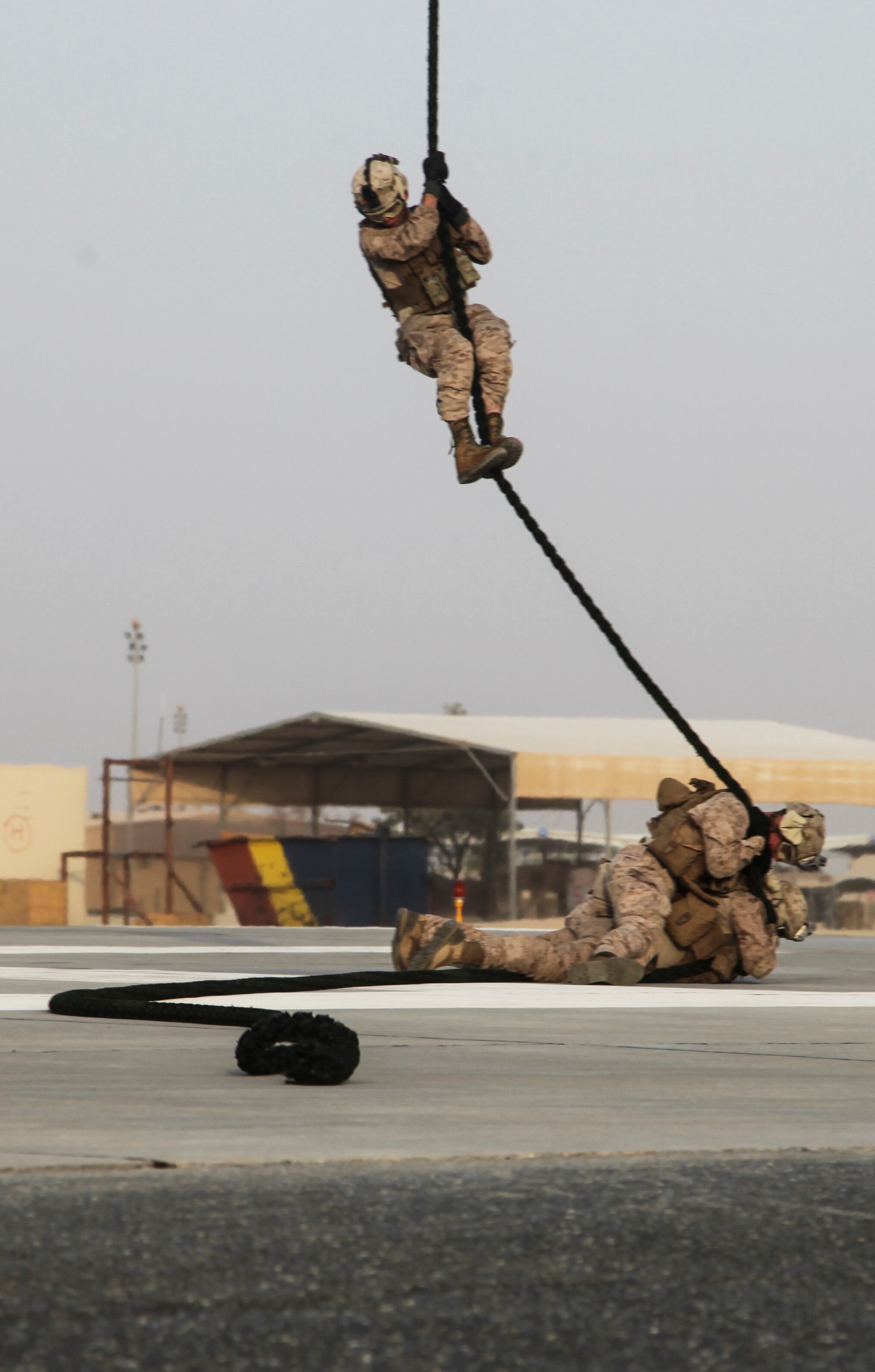 U.S. Marines with India Company, 3rd Battalion, 7th Marine Regiment, Special Purpose Marine Air-Ground Task Force—Crisis Response—Central Command, conduct fast rope training from an MV-22 Osprey while deployed to Southwest Asia, Sept. 16, 2015. Fast roping allows Marines to insert ground forces quickly from the air, without the need for a stabilized landing zone. The Marines and Sailors of SPMAGTF-CR-CC provide the commander of USCENTCOM with a unique set of solutions to emergent crises across a broad swath of the Middle East. (U.S. Marine Corps Photo by Cpl. Leah Agler/RELEASED)150924-N-PN275-061