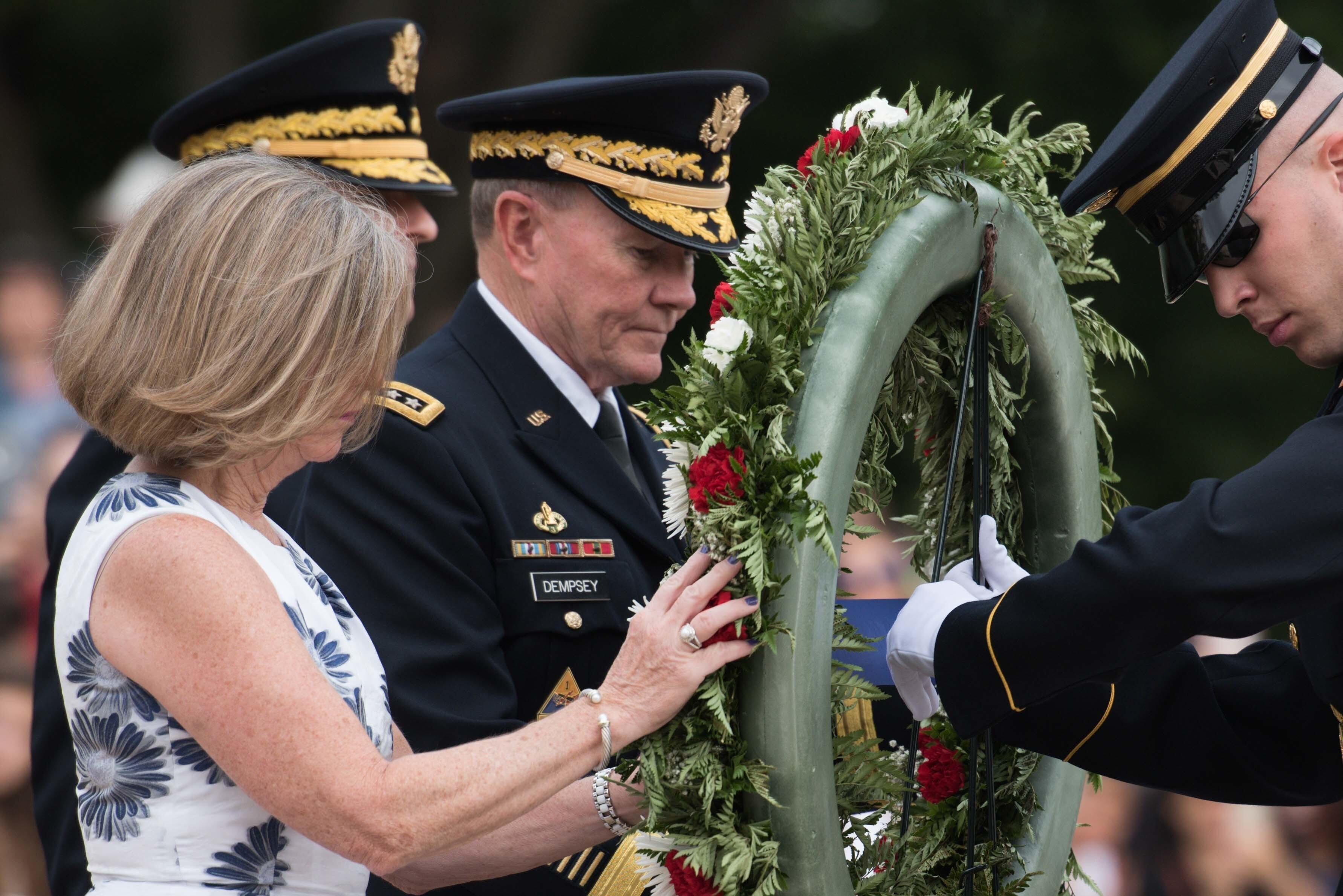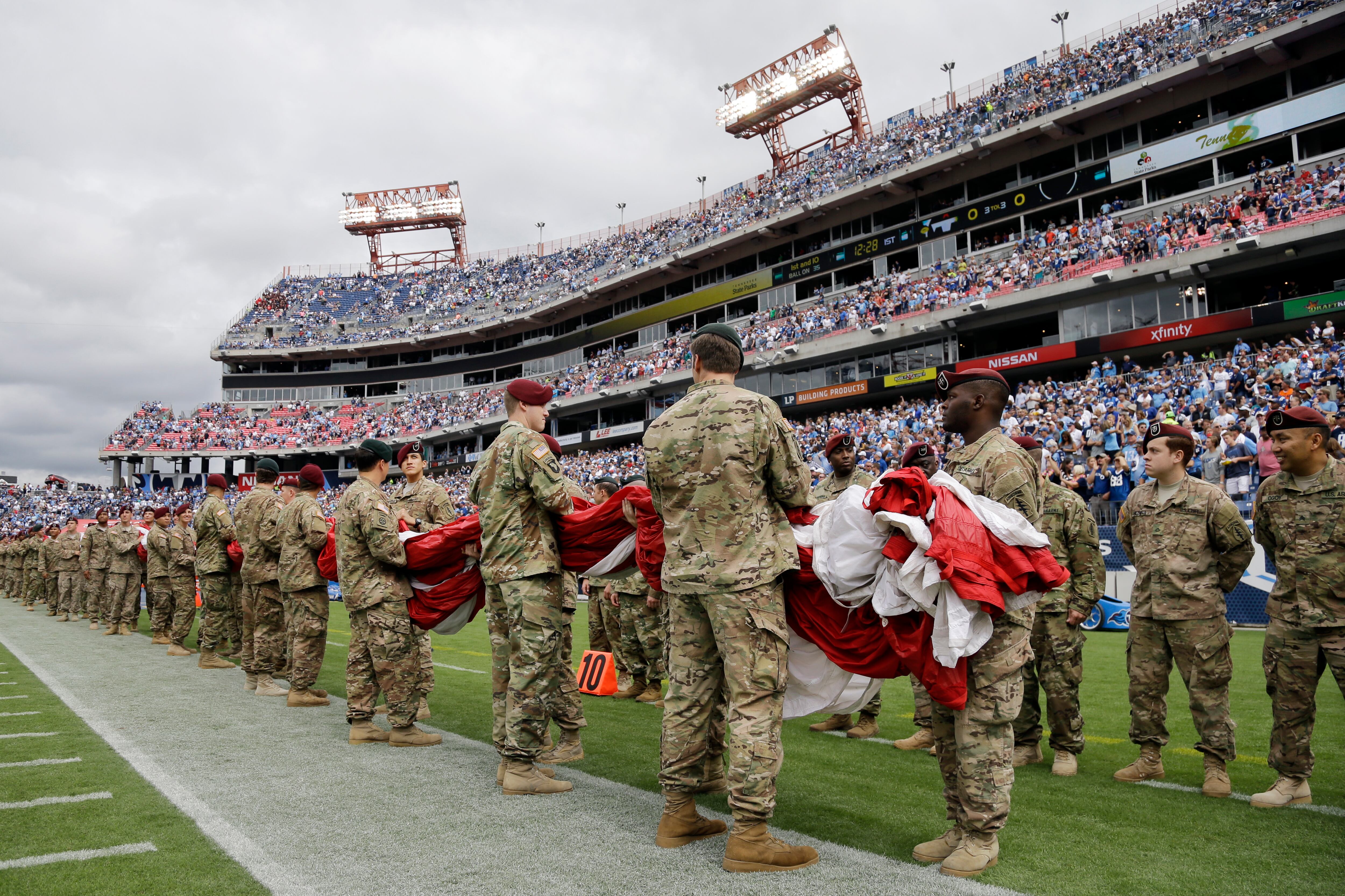 150926-N-HP195-022 NAVAL BASE VENTURA COUNTY, Calif. (Sept. 26, 2014) All six Blue Angels' F/A-18 Hornets fly in delta formation above spectators at the 2015 Point Mugu Air Show on Naval Base Ventura County. (U.S. Navy photo by Mass Communication Specialist 1st Class Christopher Okula/Released)Gen. Martin E. Dempsey, chairman of the Joint Chiefs of Staff, lays a wreath at the Tomb of the Unknown Soldier in Arlington National Cemetery, Va., Sept. 25, 2015. Hosting the wreath laying ceremony was Maj. Gen. Bradley A. Becker, commanding general, Military District of Washington. Dempsey laid the wreath to honor the Unknown Soldiers as he retires after 41 years of service. (U.S. Army Photo by Spc. Cody W. Torkelson)Soldiers prepare a flag for the pre game ceremony before an NFL football game between the Tennessee Titans and the Indianapolis Colts Sunday, Sept. 27, 2015, in Nashville, Tenn. (AP Photo/James Kenney)