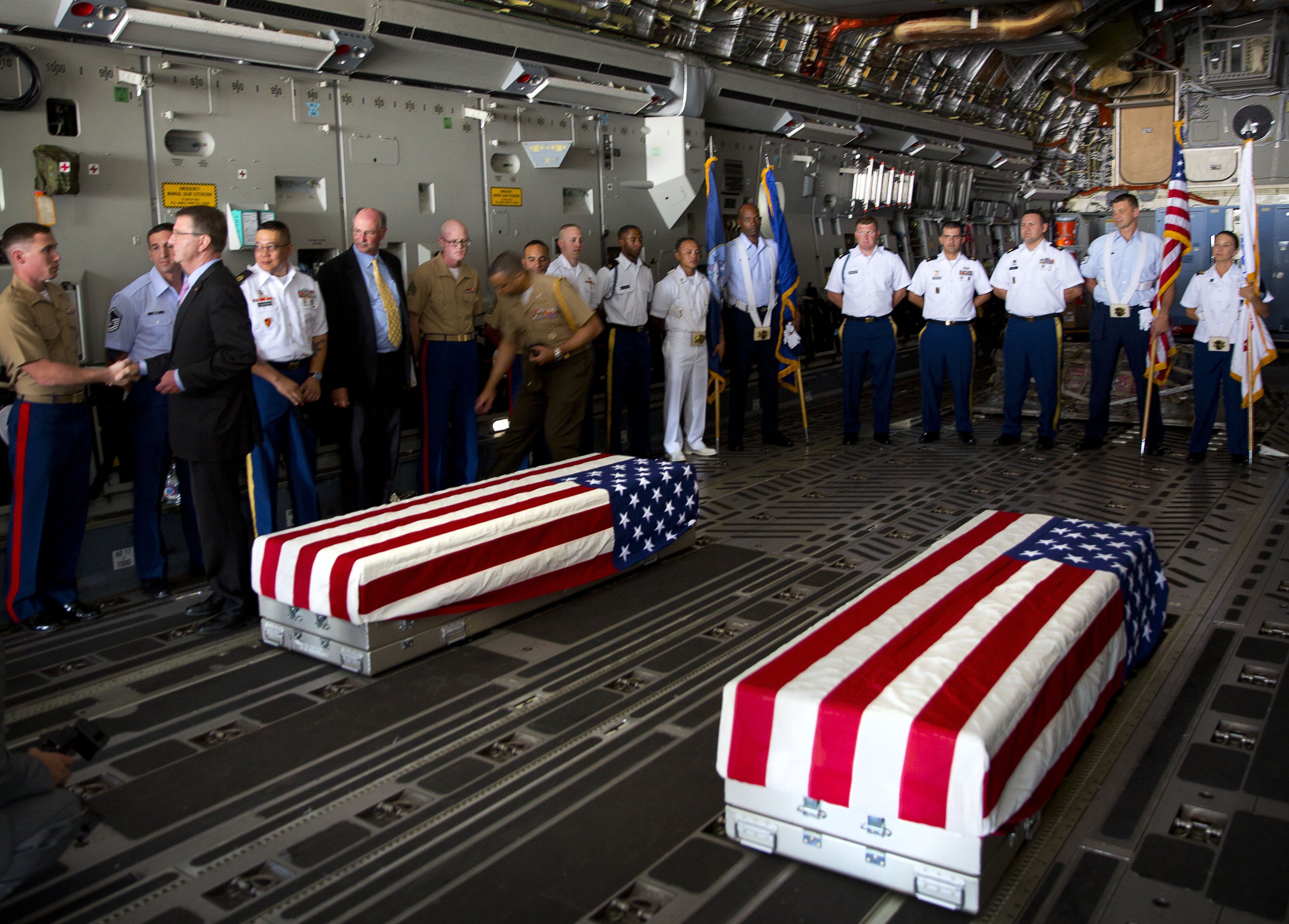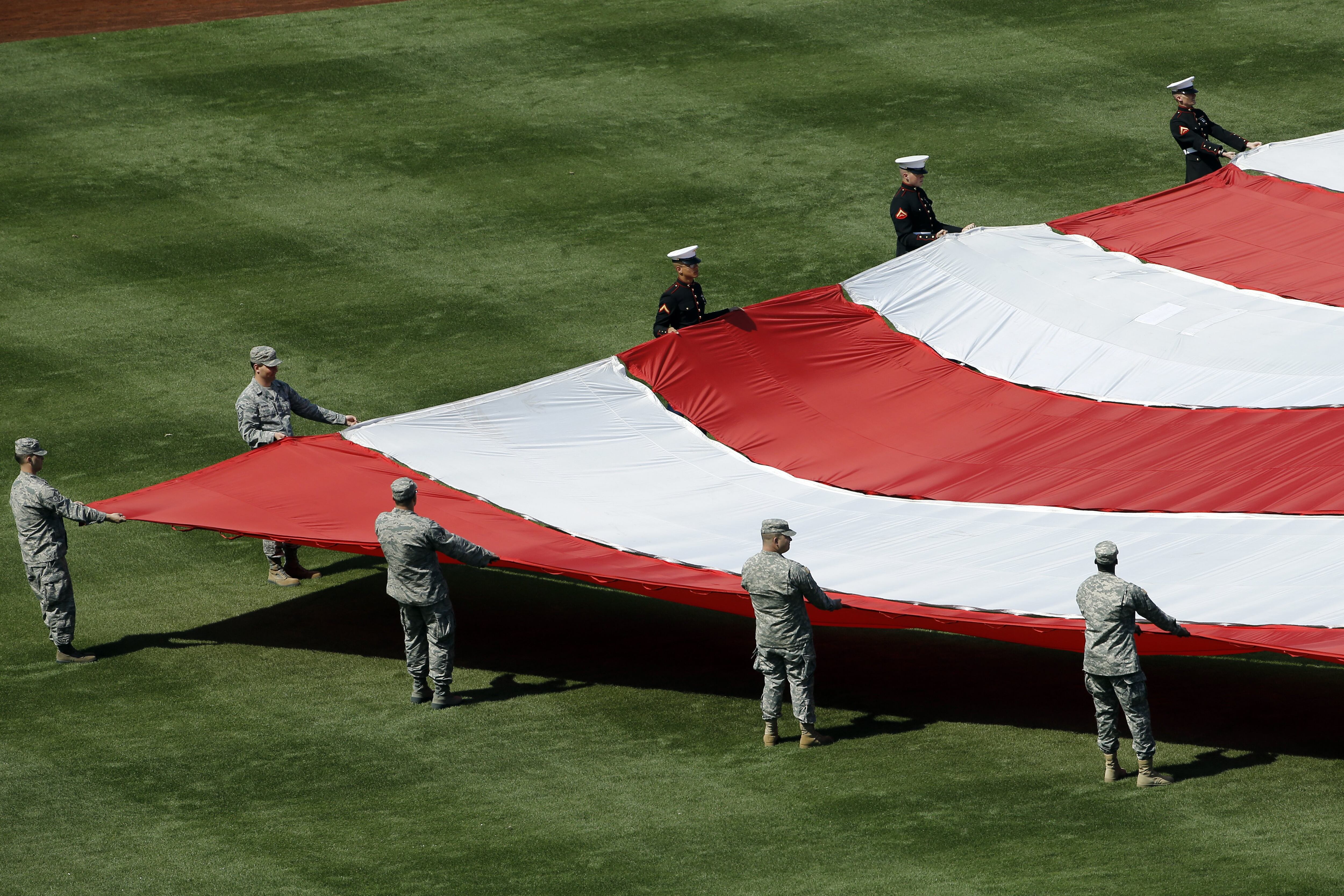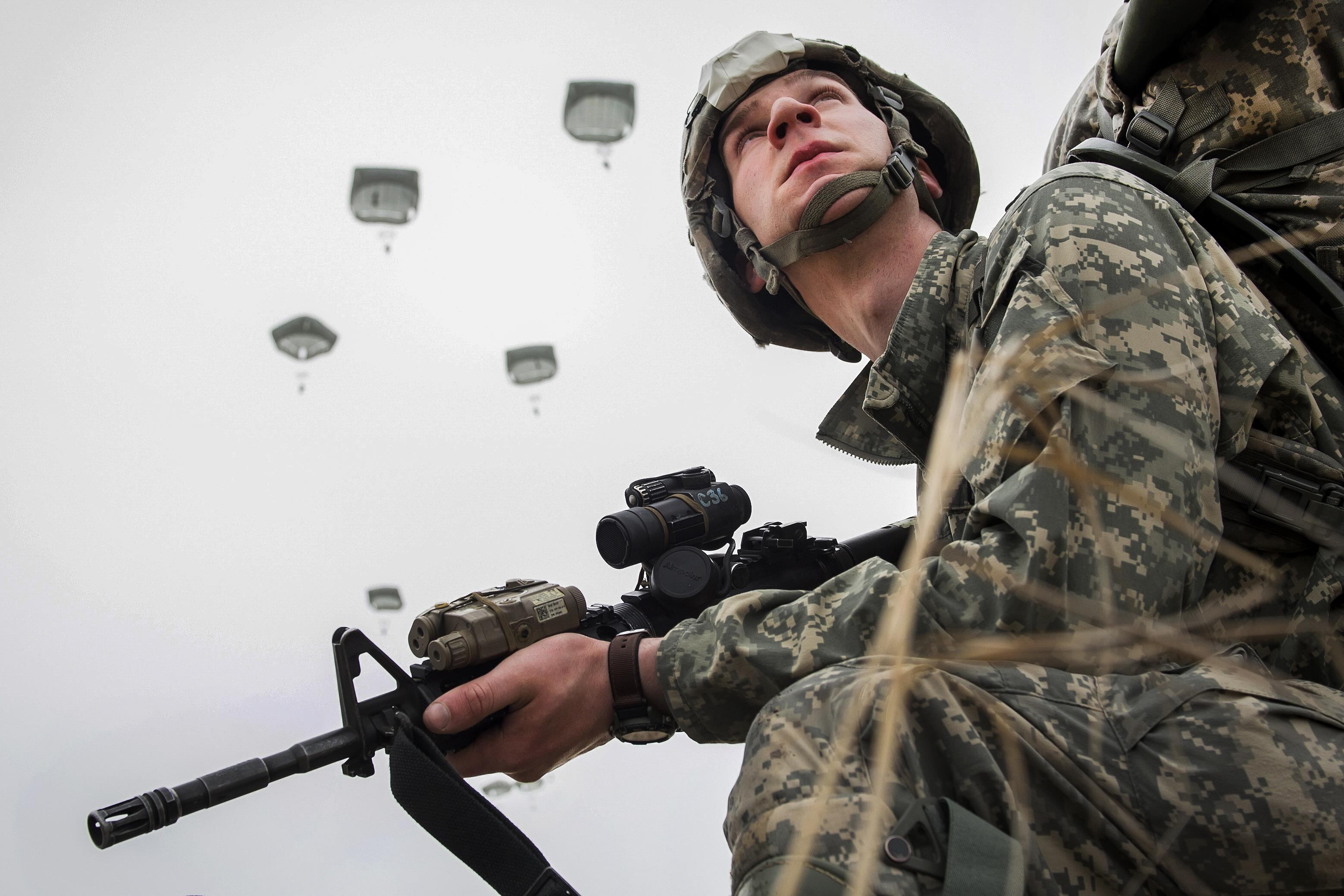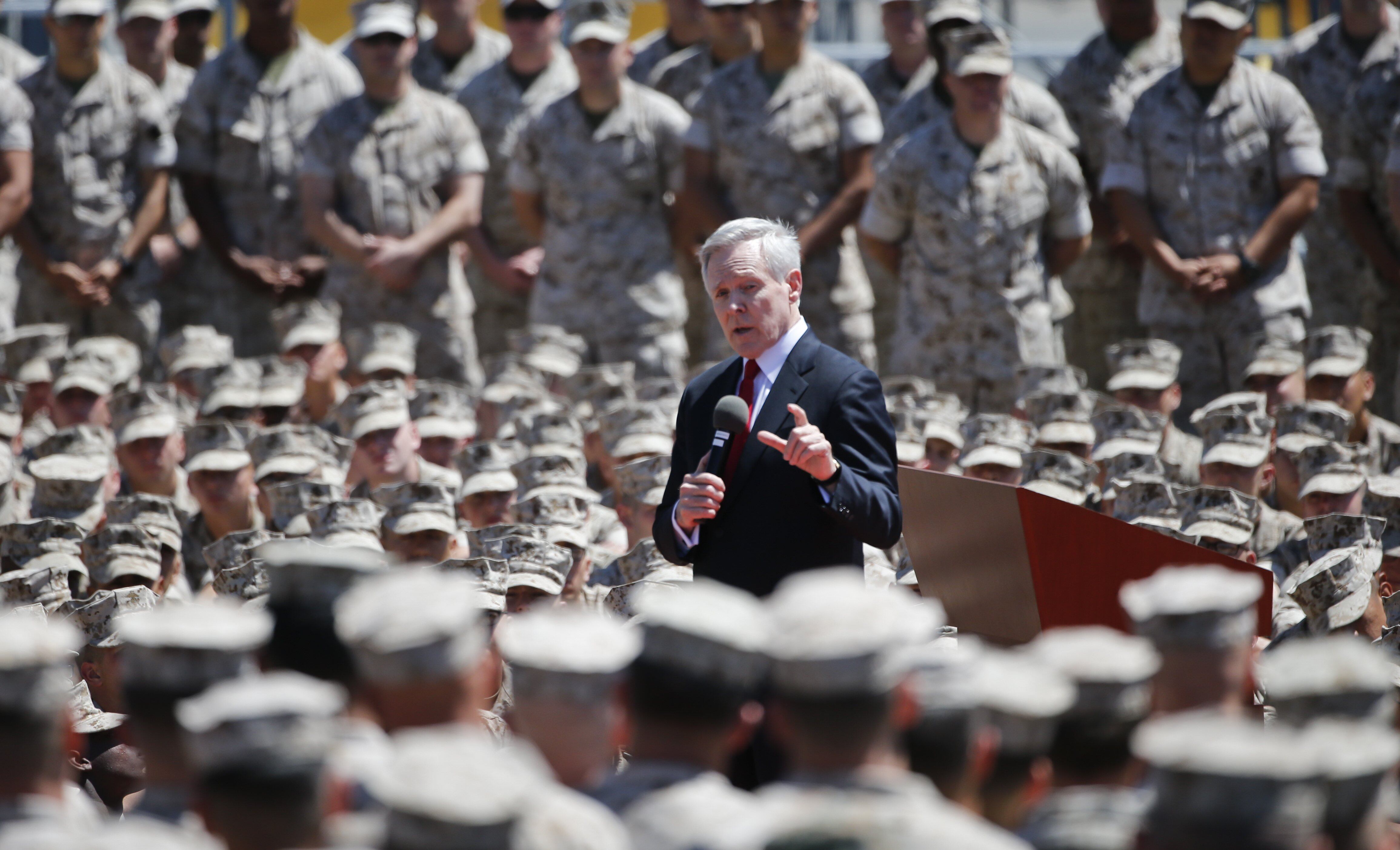 U.S. Marines with the 31st Marine Expeditionary Unit escape from a Modular Amphibious Egress Trainer at the Camp Hansen swimming pool in Okinawa, Japan, April 16, 2016. Prior to each deployment, the 31st MEU is thoroughly trained in a number of unique capabilities during a fast-paced workup cycle allowing the 31st MEU to be continually ready. (U.S. Marine Corps photo by Lance Cpl. Carl King Jr.)U.S. Defense Secretary Ash Carter, second left, shakes hand with U.S. military members after they loaded the casket what they believe may be the remains of one to two crew members from a B-24 bomber that crashed during World War II in C-17 aircraft after a ceremony at the Palam airport, in New Delhi, India, Wednesday, April 13, 2016. The bomber was on a supply run from India to China over the Himalayan Mountains when it went missing in 1944. The return of the remains to the U.S. represents the first repatriation of WWII-era remains from India. (AP Photo/Manish Swarup)U.S. Navy Chief Warrant Officer 3 Hector Arroyo signals to an E/A-18G Growler, assigned to the Electronic Attack Squadron (VAQ) 130, on the flight deck of the aircraft carrier USS Dwight D. Eisenhower (CVN 69) in the Atlantic Ocean, April 11, 2016. The Eisenhower was underway preparing for an upcoming scheduled deployment. (U.S. Navy photo by Mass Communication Specialist 3rd Class J. Alexander Delgado)Army Spc. Nathan Lycan provides security during a practice forced-entry parachute assault onto Malemute drop zone at Joint Base Elmendorf-Richardson, Alaska, April 5, 2016. Lynn is assigned to the 25th Infantry DivisionÕs Headquarters Company, 3rd Battalion (Airborne), 509th Infantry Regiment, 4th Brigade Combat Team (Airborne). Air Force photo by Justin Connaher Marine Corps Lance Cpl. Corey Johnson, left, and Lance Cpl. Daniel Lopez fire their M4 carbines from behind a barricade during combat marksmanship training at Camp Pendleton, Calif., March 31, 2016. The event aims to hone combat marksmanship skills, including how to shoot, move and communicate with a buddy. Johnson and Lopez are mortarmen assigned to the 1st Marine Division's Weapons Company, 3rd Battalion, 1st Marine Regiment. Marine Corps photo by Cpl. Garrett White Lisa Hodgden, an Air Force athlete, and her military working dog, Boston, share a moment during a wheelchair basketball session at the adaptive sports camp at Eglin Air Force Base, Fla., April 4, 2016. Air Force photo by Samuel King Jr. U.S. Army Paratroopers with the 173rd Airborne Brigade provide security during a tactical bridge crossing as part of exercise Saber Junction at the Joint Multinational Readiness Center in Hohenfels, Germany, April 12, 2016. The exercise was designed to evaluate the readiness of the Army’s Europe-based combat brigades to conduct unified land operations and promote interoperability in a joint, multinational environment. (U.S. Army photo by Gertrud Zach)Sailors clear a path to a fighting position on Camp Badger during International Mine Countermeasures Exercise 2016 in Aqaba, Jordan, April 3, 2016. The Navy led the multilateral exercise, which is the worldÕs largest maritime exercise with forces from more than 30 nations training across the Middle East. Navy photo by Petty Officer 2nd Class Sean Furey Navy Secretary Ray Mabus speaks to Marines regarding women in combat during a speech at the Camp Pendleton Marine Base, Tuesday, April 12, 2016, at Camp Pendleton, Calif. (AP Photo/Lenny Ignelzi)Capt. Nicholas Eberling and Maj. Alex Turner, both pilots for the Thunderbirds, perform the knife-edge pass over an F-35A Lightning II static display during the Luke Air Force Base Air Show at Luke AFB, Ariz., April 3, 2016. (U.S. Air Force photo/Tech. Sgt. Christopher Boitz)Members of the military hold a large flag over the field ahead of the Philadelphia Phillies home opening day baseball game against the San Diego Padres, Monday, April 11, 2016, in Philadelphia. (AP Photo/Matt Rourke)
