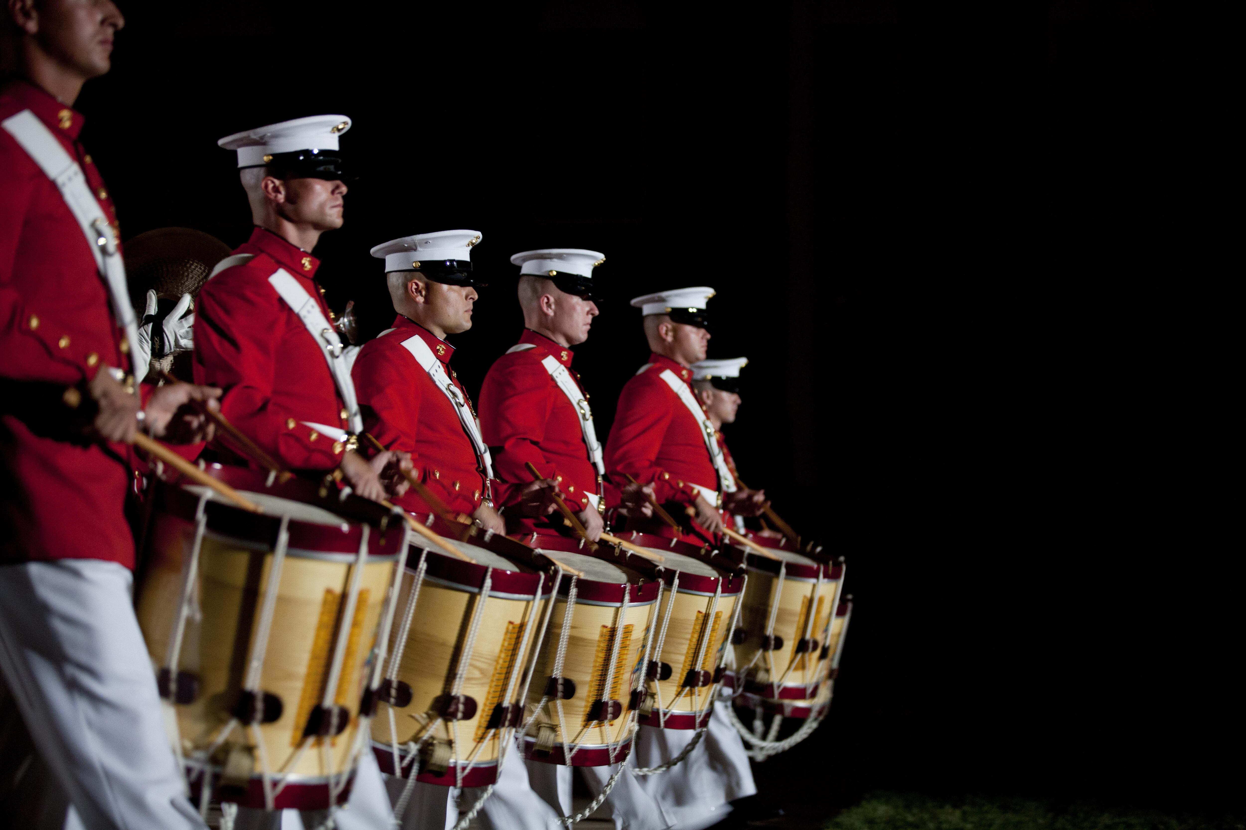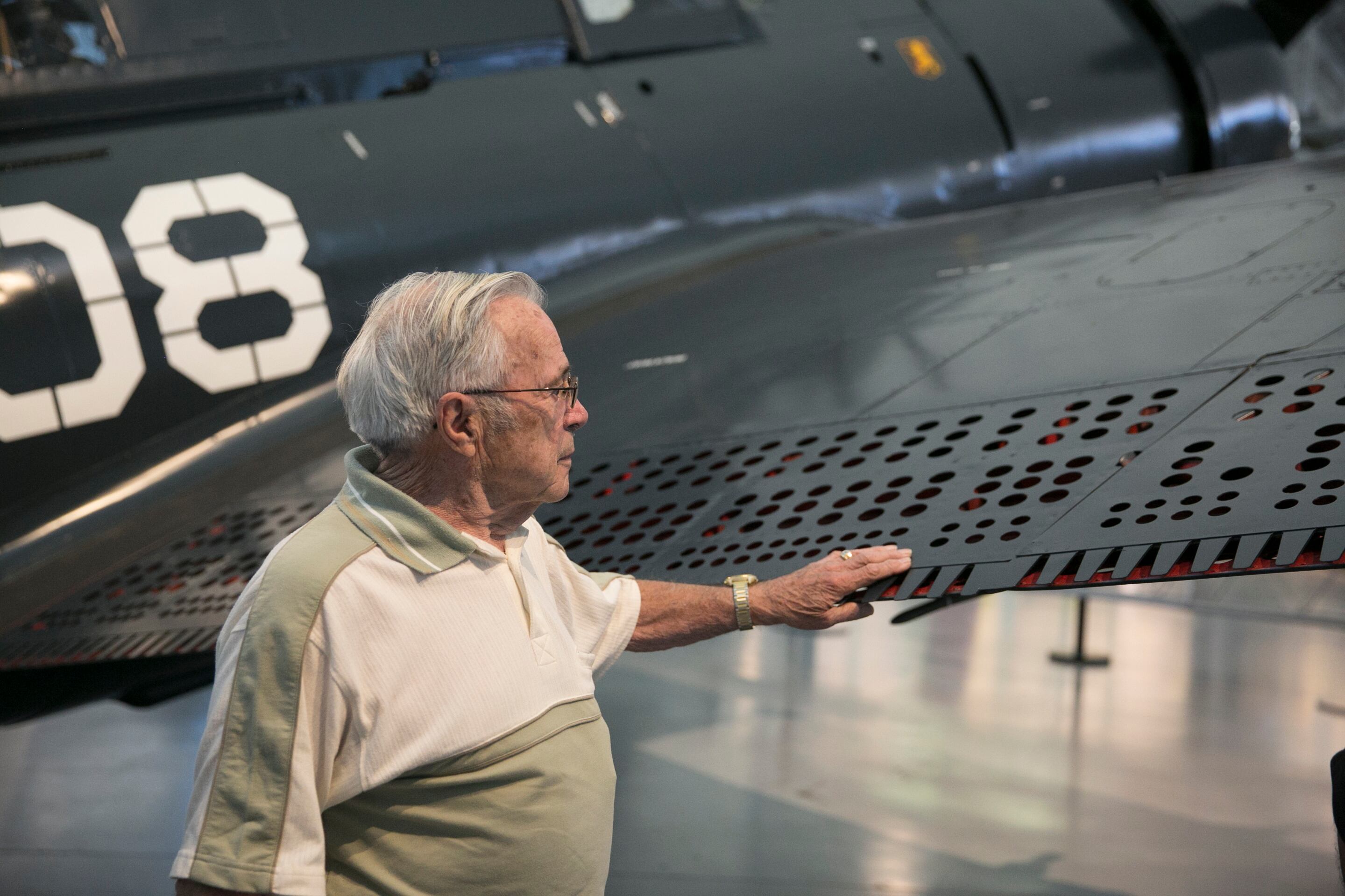 U.S. Marine Corps photo by Cpl. Ryan C. Mains Washington, D.C. - U.S. Marines with the U.S. Marine Drum and Bugle Corps perform during an evening parade at Marine Barracks Washington, D.C., Aug. 7, 2015. The Honorable George P. Shultz,the 60th United States Secretary of State, was the guest of honor for the parade, and U.S. Marine Corps Gen. Joseph F. Dunford Jr., 36th commandant of the Marine Corps, was the hosting official for that same parade. The Evening Parade began in 1934 and features the Silent Drill Platoon, the U.S. Marine Band, the U.S. Marine Corps Drum and Bugle Corps, and two marching companies. More than 3500 guests attend the parade every week. (U.S. Marine Corps photo by Lance Cpl. Alex A. Quiles/Released) George "Art" Plumador, 91, of Malone, N.Y., examines the restored Curtiss SB2C Helldiver he flew in during World War II at the Smithsonian National Air and Space Museum's Steven F. Udvar-Hazy Center in Chantilly, Va., on Monday, August 10, 2015. Plumador served as a radio operator and gunner aboard the dive bomber.