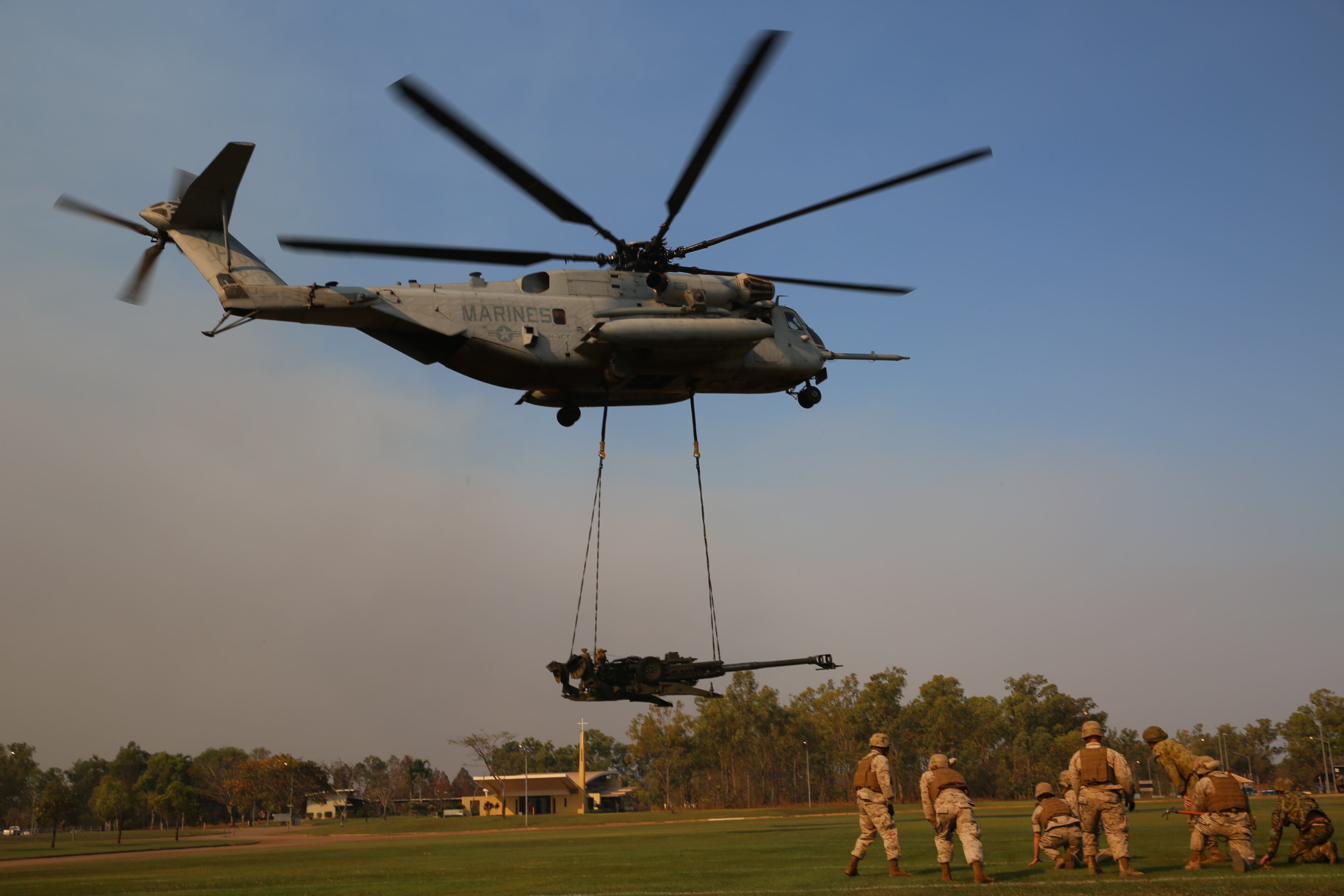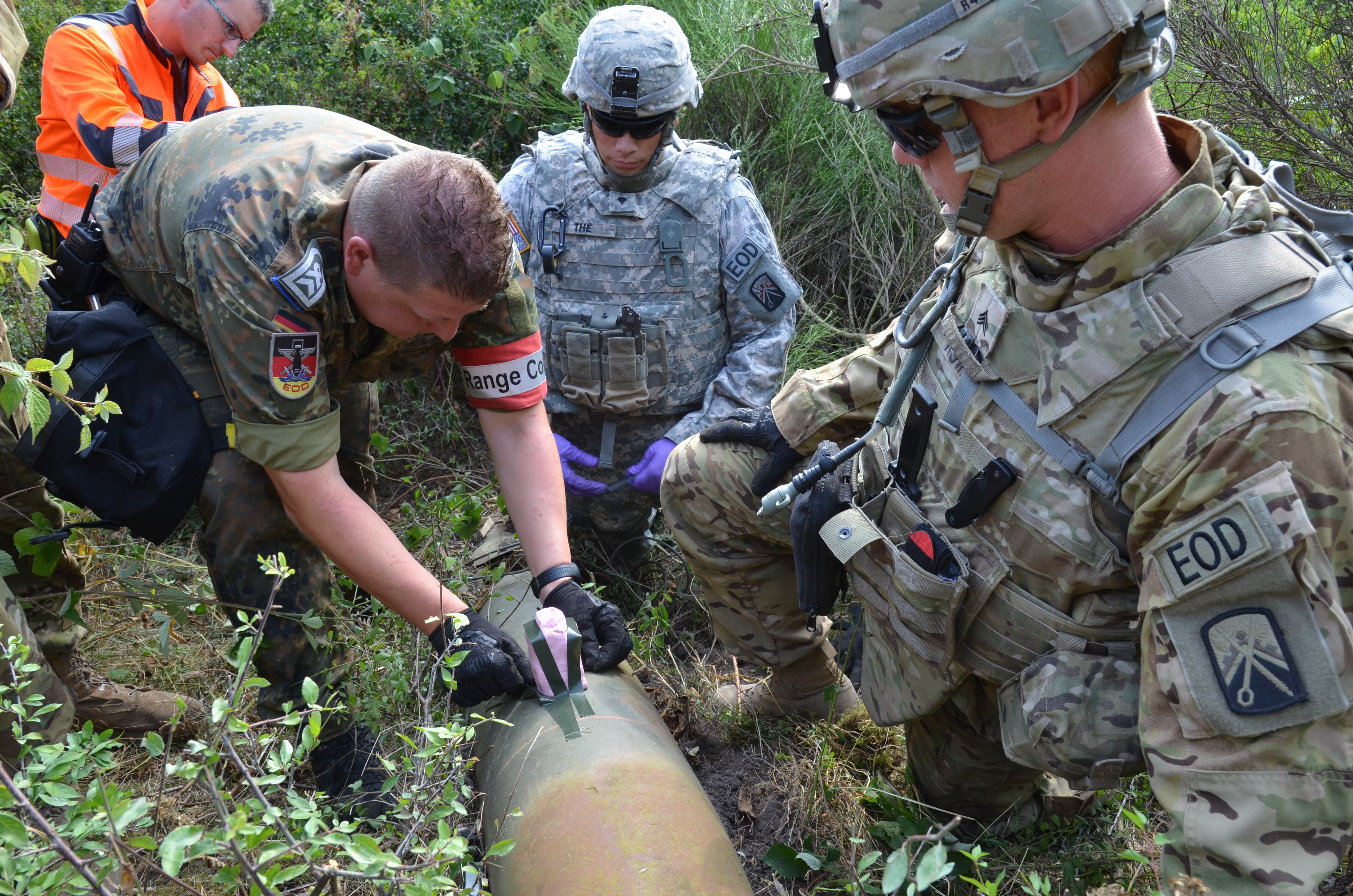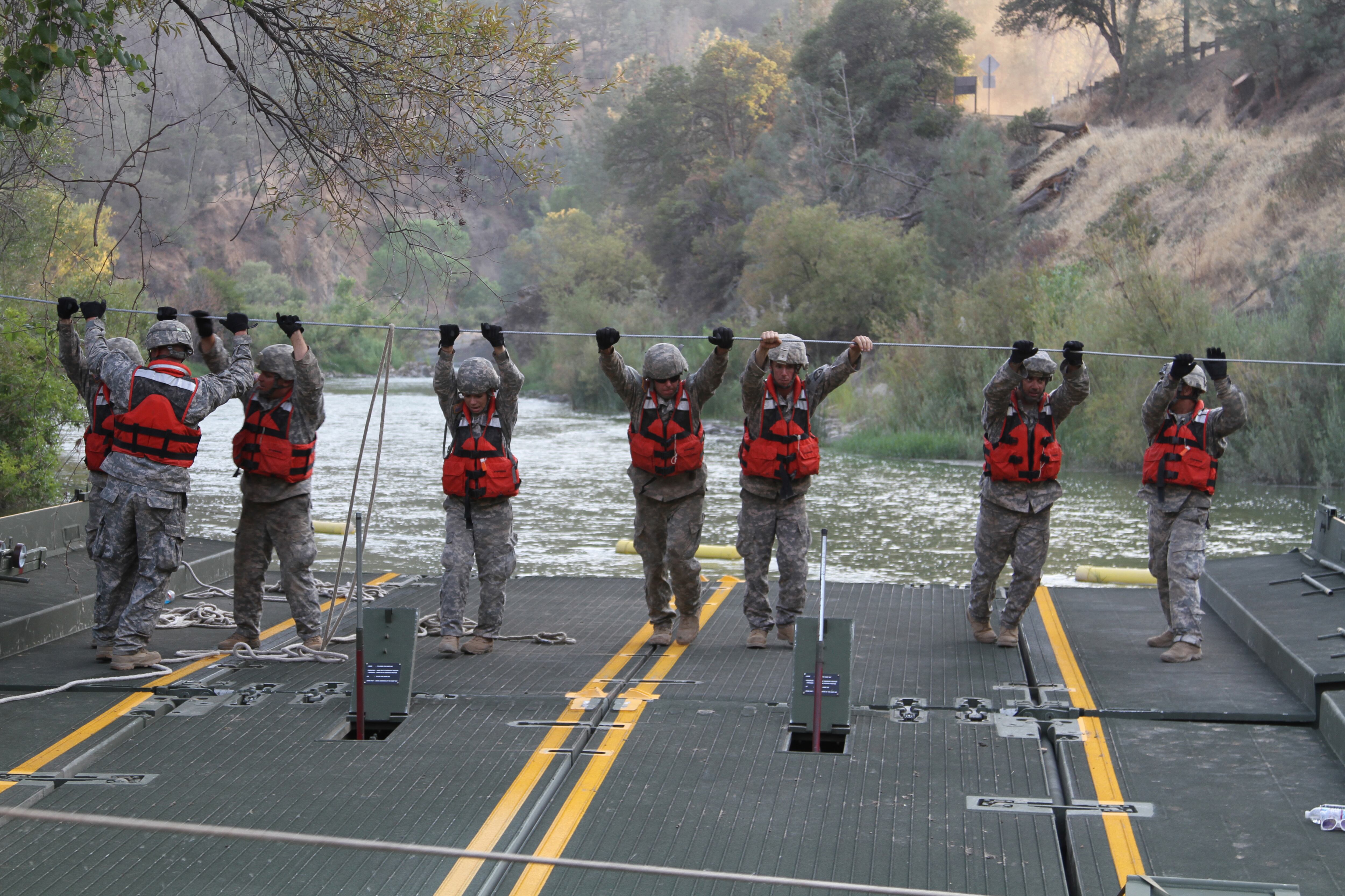 Soldiers use a steel guide line to move a ramp and bay over Cache Creek at Cache Creek Regional Park in Yolo County, Calif., Aug 7, 2015. The soldiers, assigned to the 132nd Multirole Bridge Company, are California guardsmen who constructed a temporary floating bridge to enable state equipment to cross the river to battle the Rocky Fire. California Army National Guard photo by Staff Sgt. Eddie SiguenzaA U.S. Marine Corps CH-53E Super Stallion helicopter with Marine Heavy Helicopter Squadron 463, Marine Rotational Force – Darwin, conducts an external lift of an M777A2 lightweight 155 mm howitzer Aug. 5, at Robertson Barracks, Palmerston, Northern Territory. The Marine pilots and aircrew, along with soldiers with 8th/ 12th Regiment, Royal Australian Artillery, 1st Brigade, Australian Army, Australian Defence Force, planned and conducted the external lift of the howitzer and familiarized both units with each other’s training procedures to enhance interoperability. The MRF-D six-month deployment demonstrates how the Marine Air-Ground Task Force is equipped and organized to carry out national objectives in cooperation with our international partners. (U.S. Marine Corps photo by Cpl. Reba James/Released)U.S. Soldiers assigned to 720th Explosive Ordnance Disposal Company assisted the Bundeswehr in the Baumholder Military Training Area in the detection and removal of unexploded ammunition that had been fired in the training area. The soldiers had the opportunity to exercise their skills and to work on foreign nations' ammunition, to include 155mm and 8-inch artillery rounds (U.S. Army Photo by Visual Information Specialist Erich Backes/released).The rank of general is pinned on Gen. David L. Goldfein by his wife, Dawn, and daughter, Diana Glass, during his promotion ceremony Aug. 6, 2015, in Washington, D.C. Goldfein's promotion makes him the Air Force's 38th vice chief of staff. (U.S. Air Force photo/Scott M. Ash) U.S. Marine Corps Capt. Jeffery Butler, left, and U.S. Marine Corps Pfc. Amico distribute water to residents at a shelter in Saipan, Aug. 9, 2015. The Marines are assisting local and federal agencies with typhoon relief efforts in the aftermath of Typhoon Soudelor, which devastated the island Aug. 2-3.