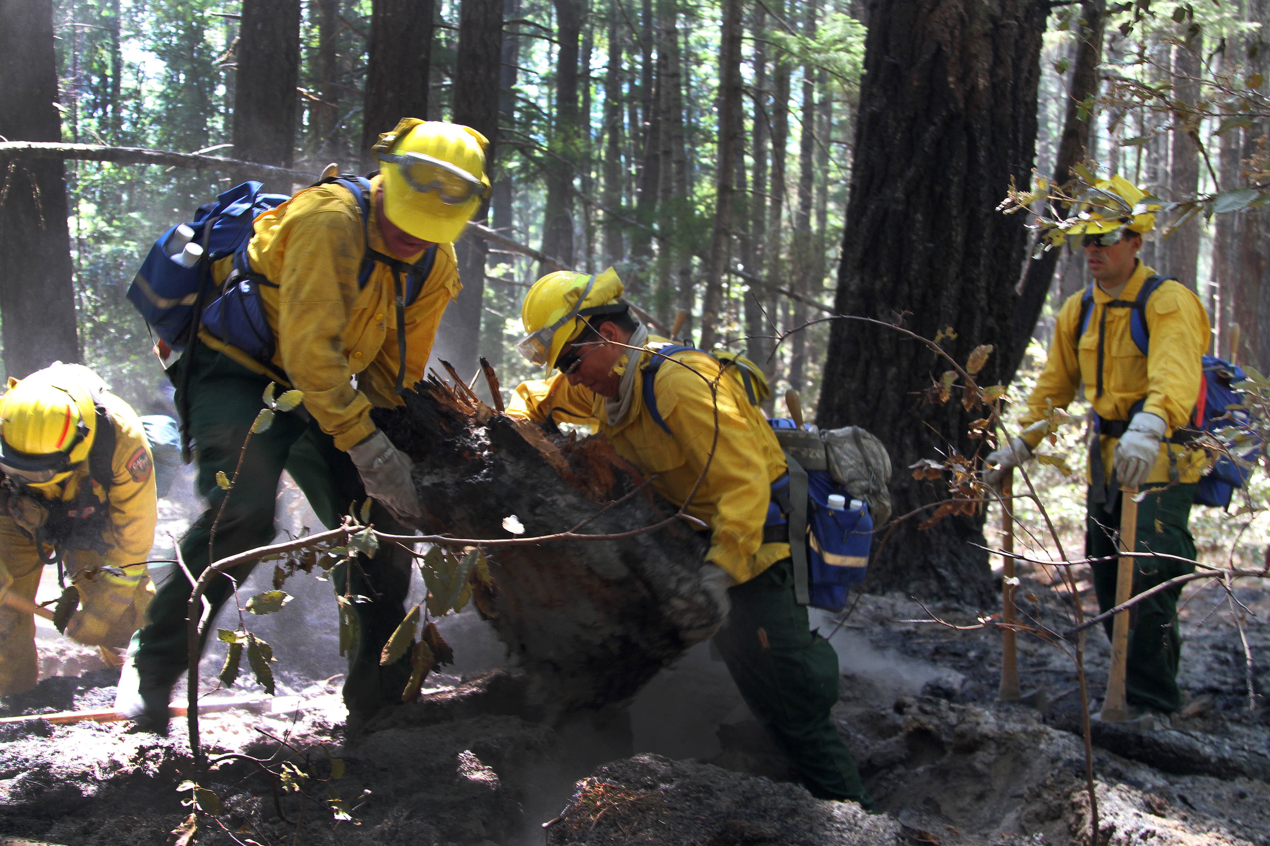 U.S. Army photo by Master Sgt. Michel Sauret Soldiers remove a burnt tree stump to extinguish a fire near the mountains of Wildcat Butte in Humboldt County, Calif., Aug. 9, 2015. The soldiers are assigned to the California Army National Guard's Task Force Alpha. More than 200 guardsmen spent several days at the Humboldt Lightning Fire base camp performing mop-up duties to prevent future wildfires.