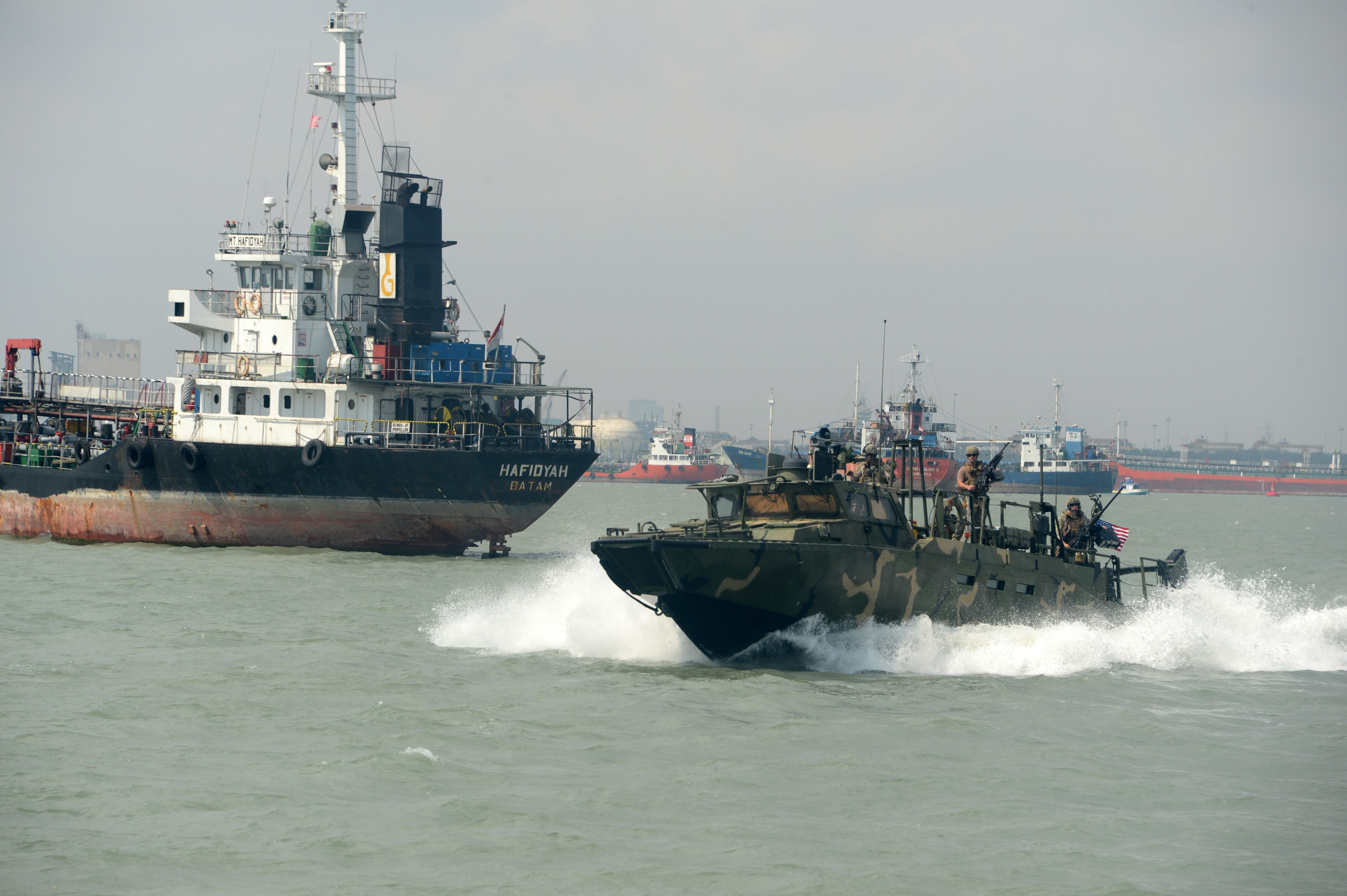 SURABAYA, Indonesia (Aug. 7, 2015) Sailors assigned to Coastal Riverine Squadron (CRS) 3 and Indonesian “Kopaska” Naval Special Forces practice interdiction techniques aboard a riverine command boat during Cooperation Afloat Readiness and Training (CARAT) Indonesia 2015. In its 21st year, CARAT is an annual, bilateral exercise series with the U.S. Navy, U.S. Marine Corps and the armed forces of nine partner nations. (U.S. Navy photo by Mass Communication Specialist 1st Class Joshua Scott/Released)