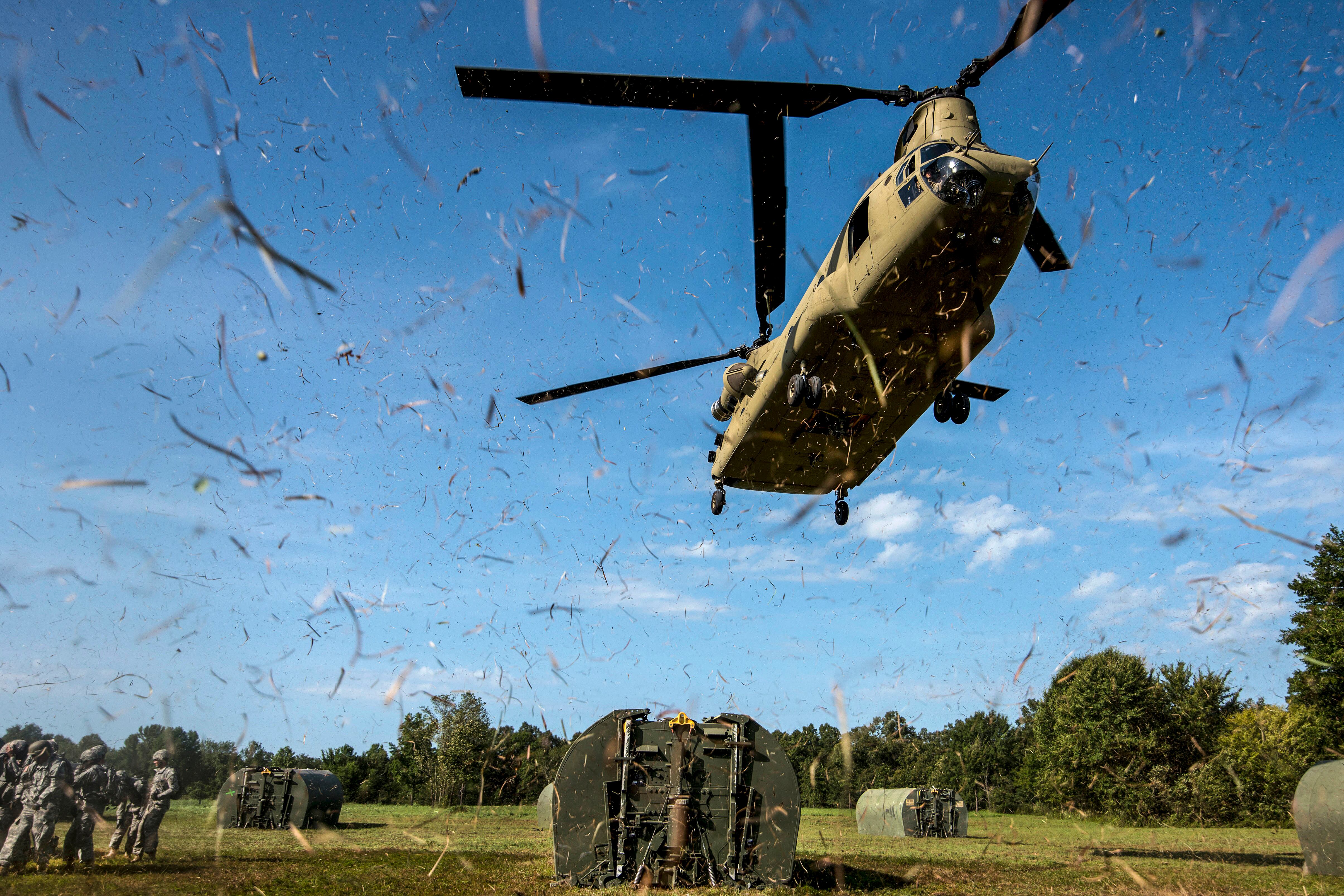 An Army CH-47 Chinook helicopter prepares to pickup a bridge bay during slingload training on Fort Chaffee, Ark., July 31, 2015. Soldiers from Army Reserve and active-duty units trained during River Assault, an exercise involving Army engineers and support elements to create a modular bridge across the Arkansas River at Fort Chaffee, Ark.