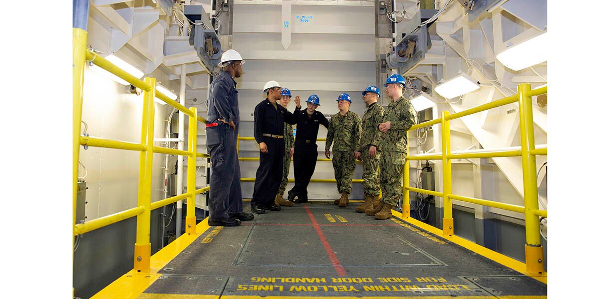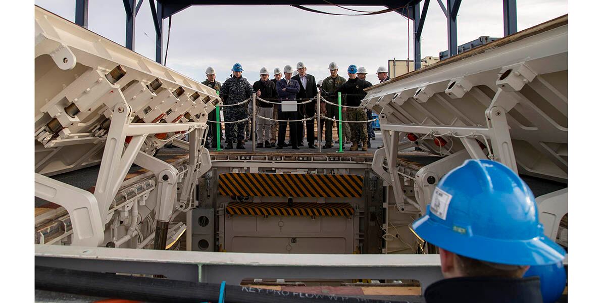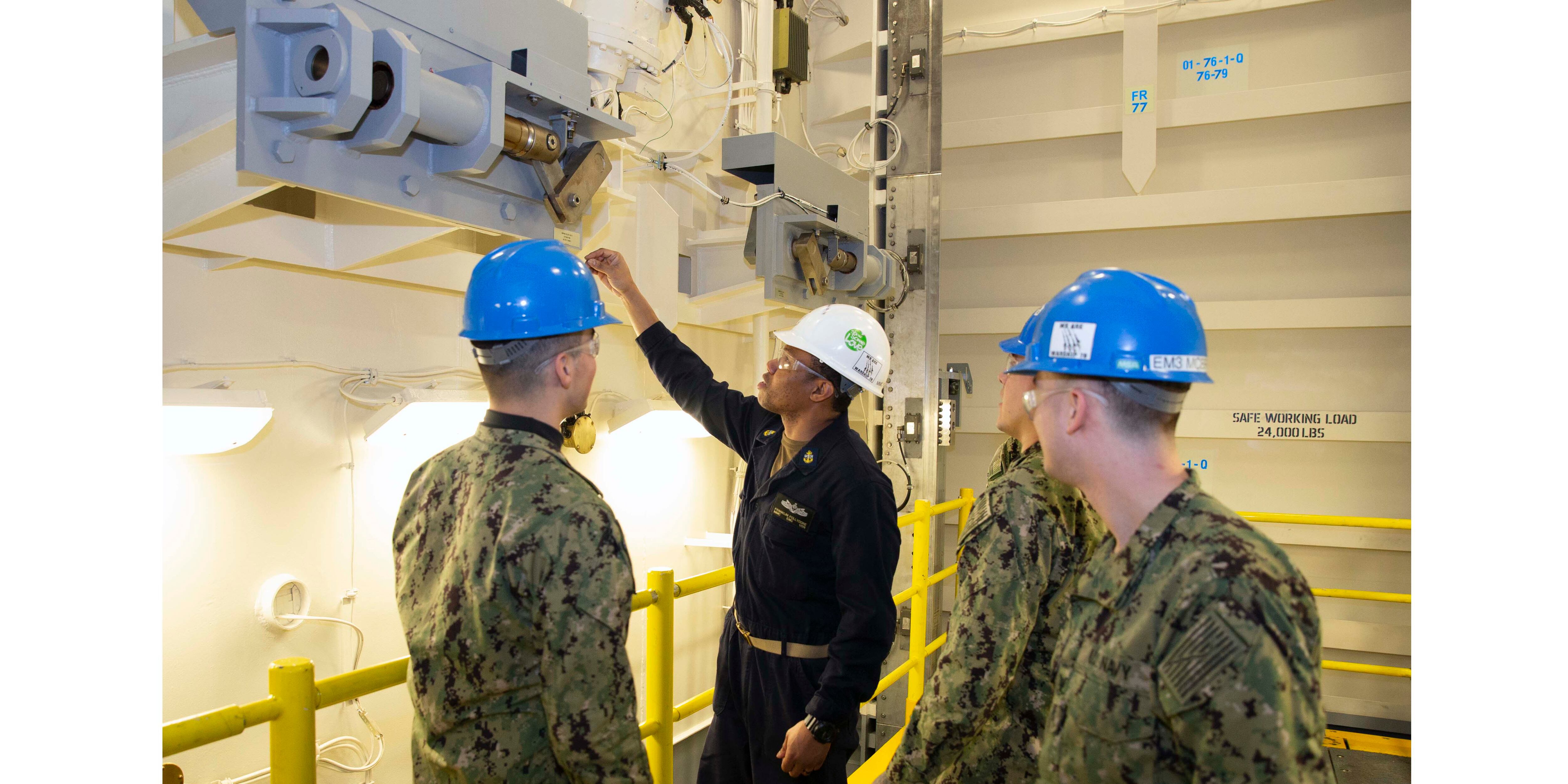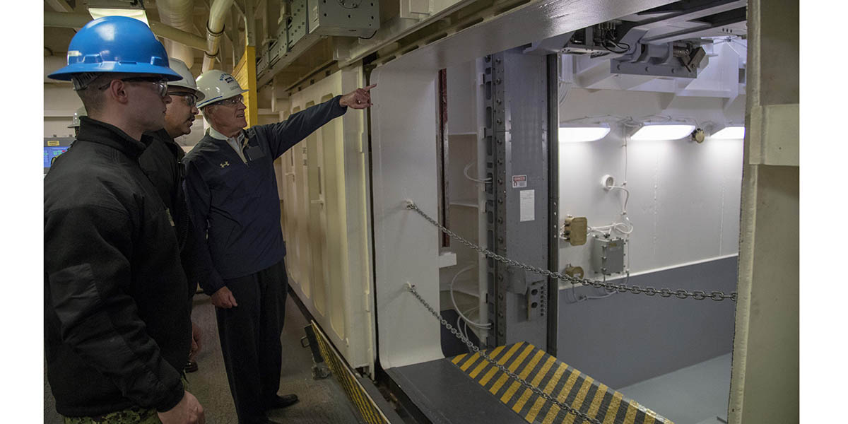 Secretary of the Navy Richard V. Spencer is briefed by the aircraft carrier Gerald R. Ford’s skipper, Capt. John J. Cummings on the Upper Stage 1 advanced weapons elevator from atop Ford's flight deck.(Mass Communication Specialist 2nd Class Kiana A. Raines/Navy)Chief Machinist's Mate Franklin Pollydore, second from left, from Georgetown, Guyana, goes over safety procedures for the Upper Stage 1 advanced weapons elevator delivered to the ship by the shipyard. (Mass Communication Specialist 1st Class Jeff Troutman/Navy)Secretary of the Navy Richard V. Spencer is briefed by Lt. Cmdr. Chabonnie Alexander, the aircraft carrier Gerald R. Ford’s ordnance handling officer, on the Upper Stage 1 advanced weapons elevator during a tour of the Navy’s newest aircraft carrier. (Mass Communication Specialist 2nd Class Kiana A. Raines)Sailors from teh aircraft carrier Gerald R. Ford's weapons department get a familiarization new advanced weapons elevator after the ship took delivery of it from the shipyard. (Mass Communication Specialist 1st Class Jeff Troutman/Navy)