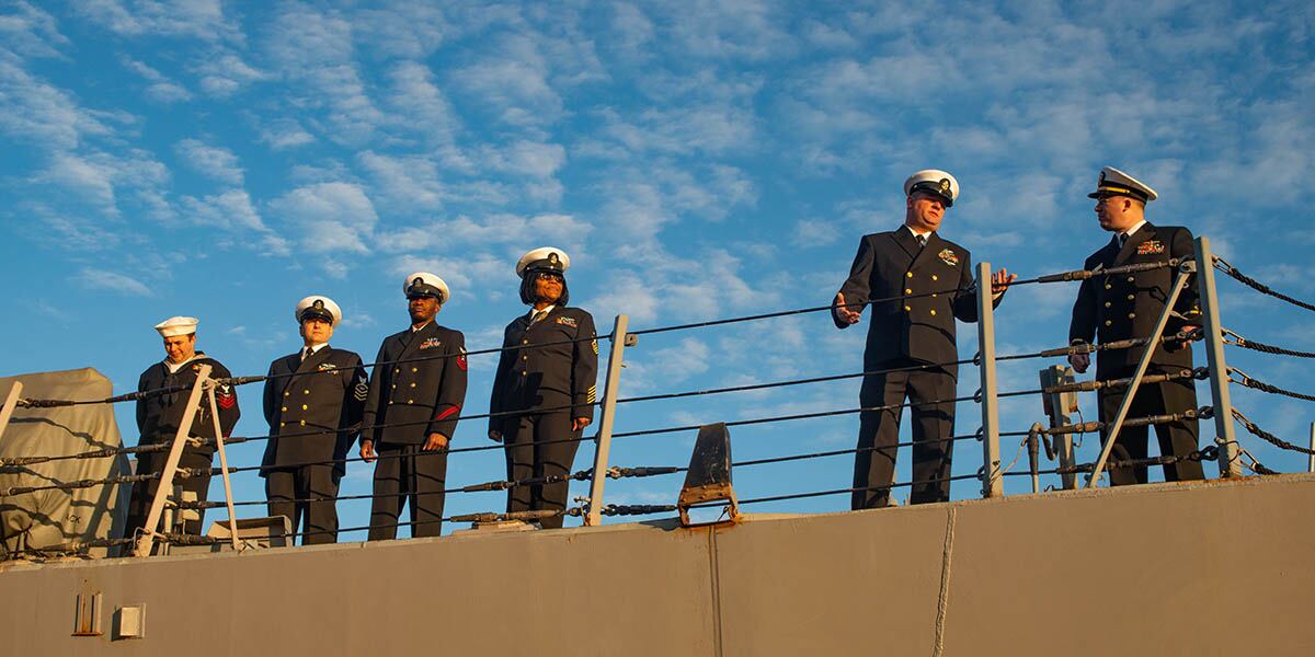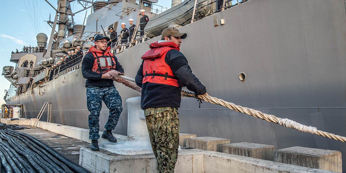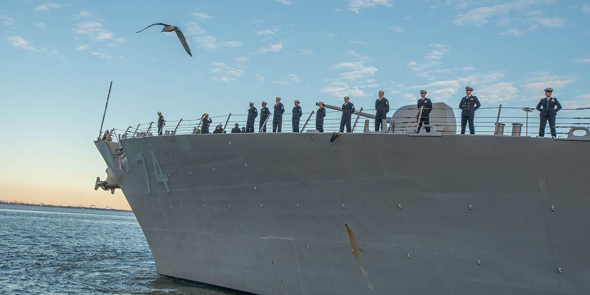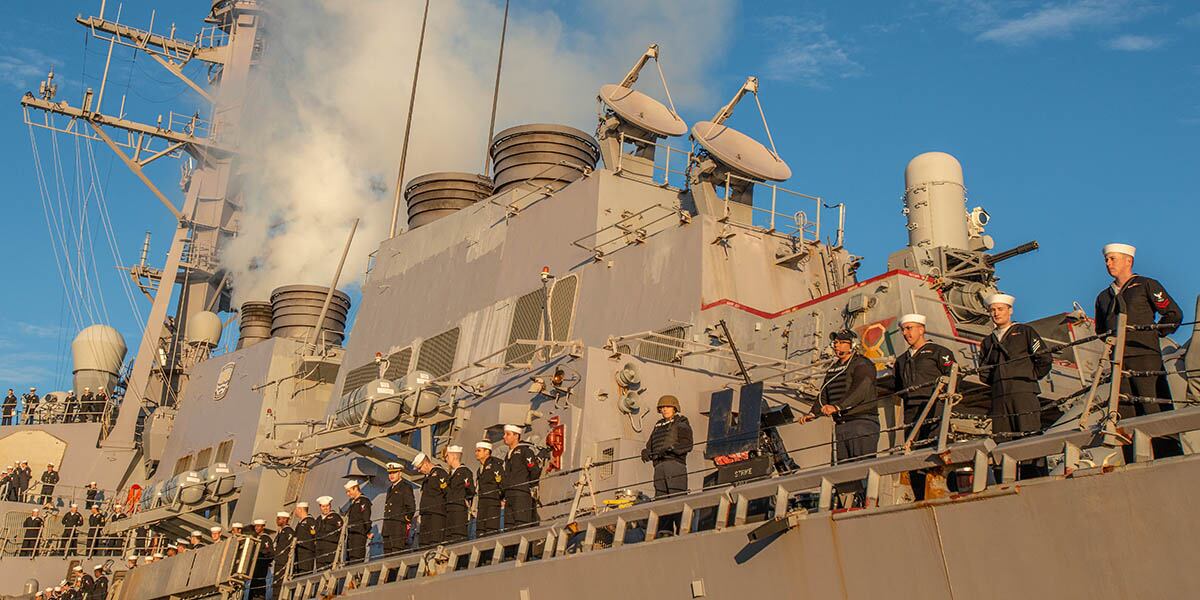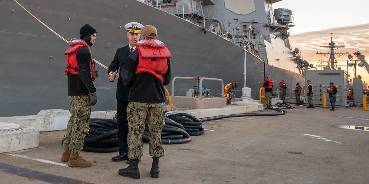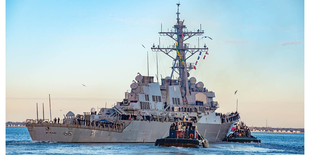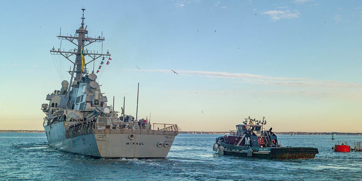 Naval Station, Norfolk - Sailors man the rails topside as the guided missile destroyer McFaul awaits word to cast off lines and deploy. (Mark D. Faram/staff)Naval Station, Norfolk - Rear Adm. John Meier, talks with sailors from the guided missile destroyer Jason Dunham who are preparing to cast off the destroyer McFaul's lines. (Mark D. Faram/staff)Naval Station, Norfolk - Lt. Kevin Jackson, the guided missile destroyer McFaul's chaplain and Religious Program Specialst Seaman apprentice say goodbye to friends as the ship prepairs for departure. (Mark D. Faram/staff)Naval Station, Norfolk - Operations Specialist 3rd Class (SW) Michael Bischoff gives direction to Sonar Technician (Surface) 3rd Class Jorge Granados as the pair cast off the final lines ofthe guided-missile destroyer McFaul, allowing the ship to pull away from the pier. (Mark D. Faram/staff)Naval Station, Norfolk - As the engineers kick up the turbines below, the crew of the the guided-missile destroyer McFaul, pack every available space on the ship's port side as it pulls away from the pier. (Mark D. Faram/staff)Naval Station, Norfolk - Under the watchful eye of a Moran tug, the guided-missile destroyer McFaul moves into the Elizabeth River as it departs pier 4 at Naval Station, Norfolk. (Mark D. Faram/staff)Naval Station, Norfolk - The bow of the guided-missile destroyer McFaul turns towards the Elizabeth River as it departs pier 4 at Naval Station, Norfolk. (Mark D. Faram/staff)Naval Station, Norfolk - With tugs alongside, the guided-missile destroyer McFaul, now in the Elizabeth River heads to the Chesapeake Bay.(Mark D. Faram/staff)Naval Station, Norfolk - An empty berth and coiled shore power cables are all that's left after the guided-missile destroyer McFaul, departed on deployment. (Mark D. Faram/staff)