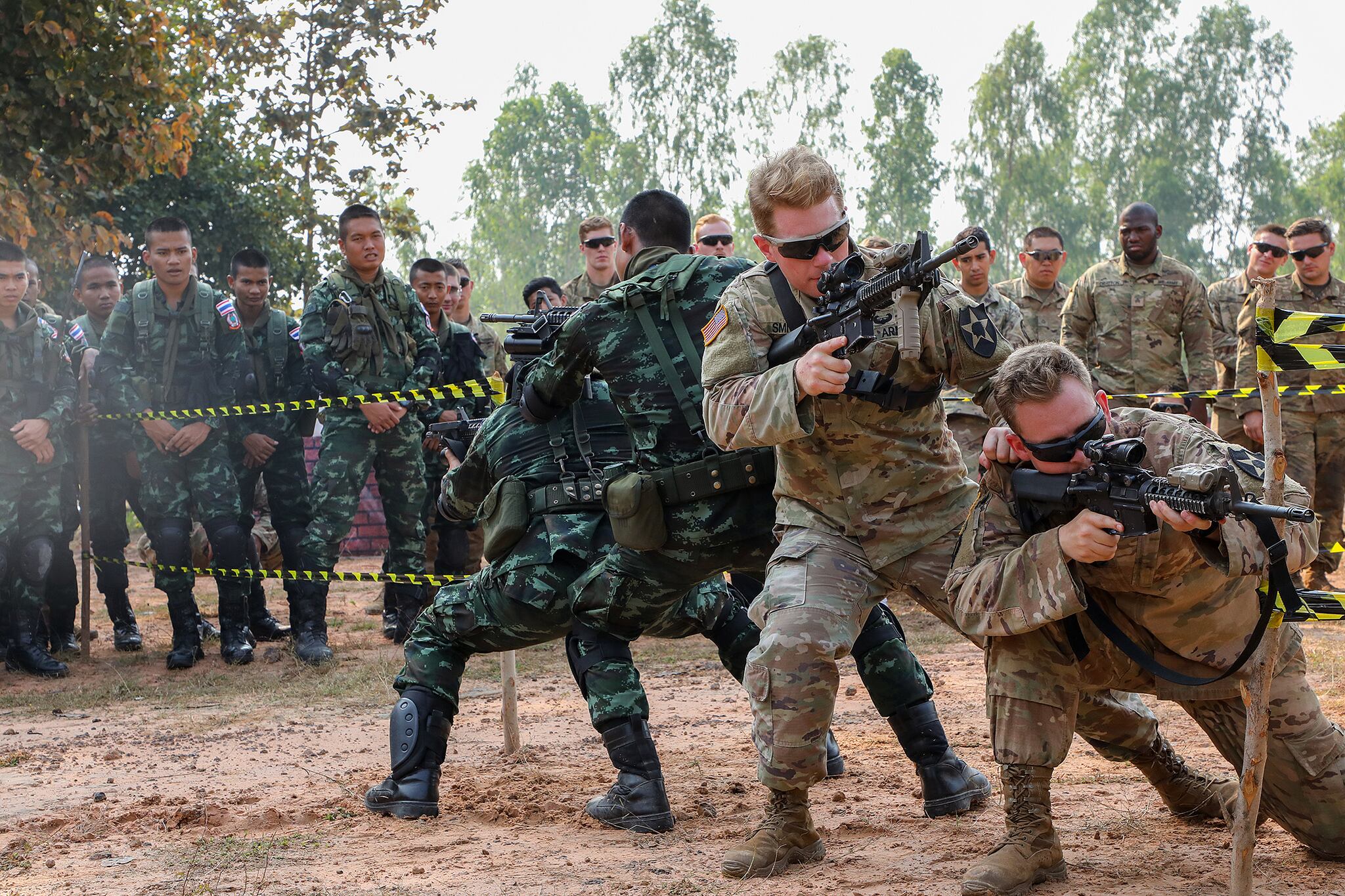 Marines hold security during a fast-roping exercise as part of visit, board, search and seizure training at Marine Corps Base Hawaii, Kaneohe Bay, Hawaii, Jan. 9, 2019. (Cpl. Isaac Cantrell/Marine Corps)U.S. soldiers and the Royal Thai Army conduct the hall clearing phase of a combined military operations in urban terrain training at Cobra Gold 2019, Feb. 13, 2019, Phitsanulok, Kingdom of Thailand. (Indo-Pacific Command)A U.S. Coast Guard MH-60 Jayhawk helicopter assigned to Air Station Kodiak flies over an active volcano near Cold Bay, Alaska, Feb. 7, 2019. (Petty Officer 1st Class Bradley Pigage/Coast Guard)Pfc. Jermaine Lewis conducts basic obedience drills with Astor Y483, a military working dog, at Panzer Kaserne, Stuttgart, Germany, Feb. 4, 2019. (Visual Information Specialist Rey Ramon/Army)Paratroopers with U.S. Army Alaska huddle over a mock casualty to protect it from the rotor-wash of a landing UH-60 helicopter at Joint Base Elmendorf-Richardson, Alaska, Feb. 20, 2019. (Sgt. Alex Skripnichuk/Army)Sailors simulate overhauling a space using a Naval Firefighting Thermal Imager on Feb. 13, 2019, during a main space fire drill in the Main Machinery Room (MMR) 2 of the amphibious dock landing ship USS Ashland (LSD 48) in the South China Sea. (Mass Communication Specialist 2nd Class Markus Castaneda/Navy)Capt. Andrew Riffe takes aim down range Feb. 9, 2019, at the weapons firing range on Eielson Air Force Base, Alaska. (Airman 1st Class Shannon Chace/Indo-Pacific Command)Bravo Company, 2nd Battalion, 116th Cavalry Regiment, conducts platoon live-fire gunnery qualification Feb.14, 2019, at the Orchard Combat Training Center. (Army)Marines provide long distance fire support while conducting the air assault course during Integrated Training Exercise 2-19 aboard Marine Corps Air-Ground Combat Center Twentynine Palms, Calif., Feb. 9, 2019. (Sgt. Victor A. Mancilla/Marine Corps)Soldiers from 10th Mountain Division take the final steps to make sure the vehicles on the railhead are ready for transport to Fort Polk, La., on Feb. 14, 2019. (Army)