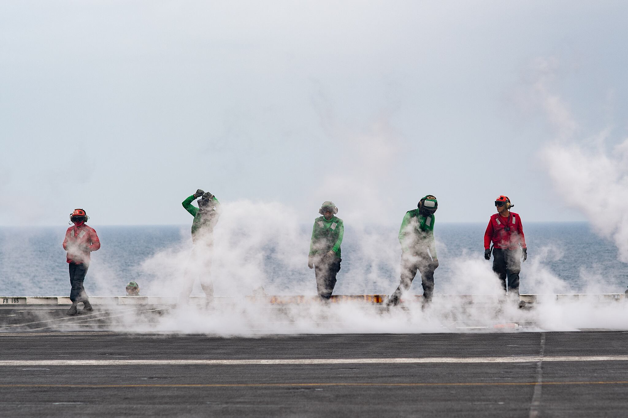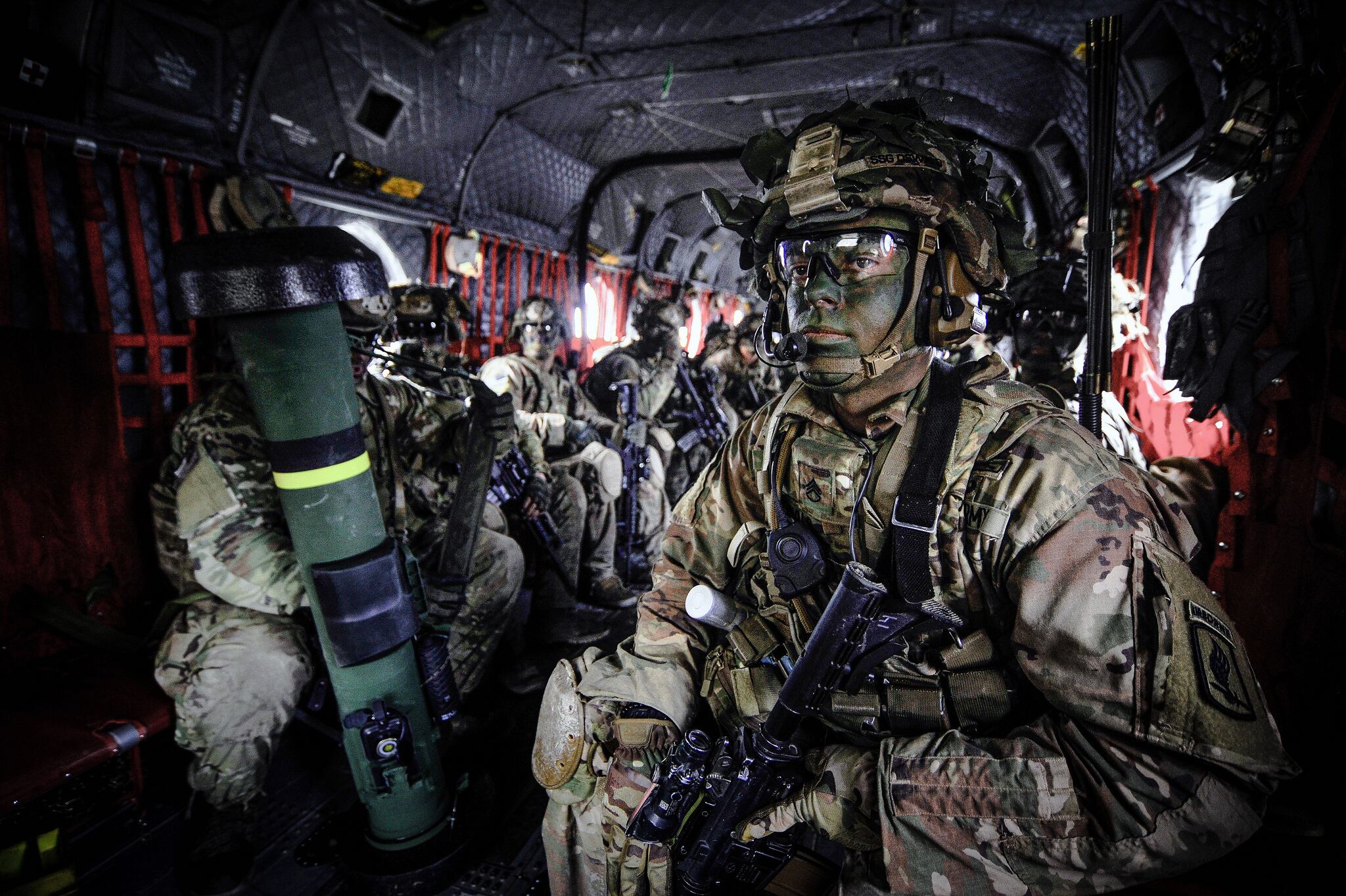 Paratroopers prepare to exit a CH-47 Chinook helicopter on March 6, 2019, during Exercise Rock Spring 19 at Grafenwoehr Training Area, Germany. (Army)An explosive ordnance disposal Marine creates a simulated improvised explosive device at Adazi Training Area, Latvia, to be used during exercise Dynamic Front 19, March 3, 2019. (Cpl. Niles Lee/Marine Corps)The U.S. Navy flight demonstration squadron, the Blue Angels, perform the Echelon Parade maneuver on March 16, 2019, during a demonstration at the El Centro Airshow at Naval Air Facility El Centro, Calif. (Mass Communication Specialist 2nd Class Timothy Schumaker/Navy)A joint terminal attack controller looks on as combat engineers demonstrate the use of various shape charges to members of the Royal Moroccan Armed Forces on March 28, 2019, during exercise African Lion. (Tech. Sgt. John Winn/Air Natioanl Guard)1st Lt. Nathaniel Lambert sights in behind a .50-caliber Special Applications Scoped Rifle on Feb. 20, 2019, during a simulated strait transit aboard the San Antonio-class amphibious transport dock ship USS John P. Murtha (LPD 26) in the Pacific Ocean. (Lance Cpl. Israel Chincio/Marine Corps)Sailors reset a steam-powered catapult on the flight deck of the aircraft carrier USS John C. Stennis (CVN 74) on March 23, 2019, in the Arabian Gulf. (U.S. Navy photo by Mass Communication Specialist 3rd Class Grant G. Grady/Navy)Visitors line up along the pier for a tour of the guided-missile destroyer USS Zumwalt (DDG 1000) on March 24, 2019, in Ketchikan, Alaska. (Mass Communications Specialist 2nd Class Jonathan Jiang/Navy)Trainees negotiate a confidence course on Feb. 27, 2019, at Sand Hill on Fort Benning, Ga. (Patrick Albright/Army)Twenty-four F-22 Raptors, a C-17 Globemaster III and an E-3 Sentry participate in a close formation taxi, known as an Elephant Walk, March 26, 2019, during a Polar Force exercise at Joint Base Elmendorf-Richardson, Alaska. (Sheila deVera/Indo-Pacom)An MH-60S Sea Hawk helicopter flies toward the aircraft carrier USS John C. Stennis (CVN 74) on March 16, 2019, in the Indian Ocean. (Mass Communication Specialist 3rd Class Grant G. Grady/Navy)