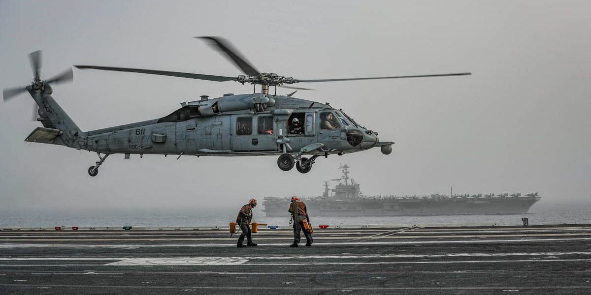 An MH-60S Sea Hawk helicopter from the "Nightdippers" of Helicopter Sea Combat Squadron 5 flies past the aircraft carrier USS Abraham Lincoln during a photo exercise with carrier John C. Stennis (US Navy photo by Mass Communication Specialist 3rd Class Jeremiah Bartelt/Navy)The Abraham Lincoln and John C. Stennis carrier strike groups conducted carrier strike force operations in the U.S. 6th Fleet. Together, the strike groups will complete high-end war fighting training., (Mass Communication Specialist 3rd Class Jeremiah Bartelt/Navy)Flight deck plane captains prepare to secure an MH-60S Sea Hawk helicopter from the "Nightdippers" of Helicopter Sea Combat Squadron 5 onboard the aircraft carrier Abraham Lincoln as John C. Stennis steams alongside during a photo exercise. (Mass Communication Specialist 2nd Class Jessica Paulauskas/Navy)The Abraham Lincoln and John C. Stennis carrier strike groups conducted carrier strike force operations in the U.S. 6th Fleet. Together, the strike groups will complete high-end war fighting training., (Mass Communication Specialist 3rd Class Jeremiah Bartelt/Navy)The Abraham Lincoln and John C. Stennis carrier strike groups conducted carrier strike force operations in the U.S. 6th Fleet. Together, the strike groups will complete high-end war fighting training., (Mass Communication Specialist 3rd Class Jeremiah Bartelt/Navy)MEDITERRANEAN SEA (April 24, 2019)