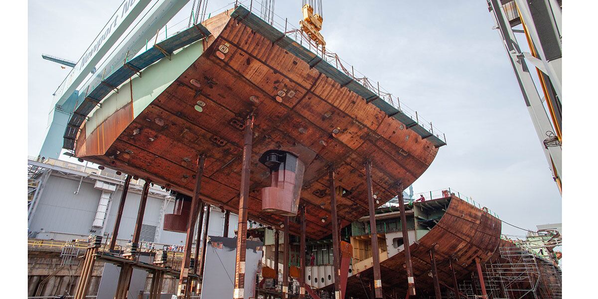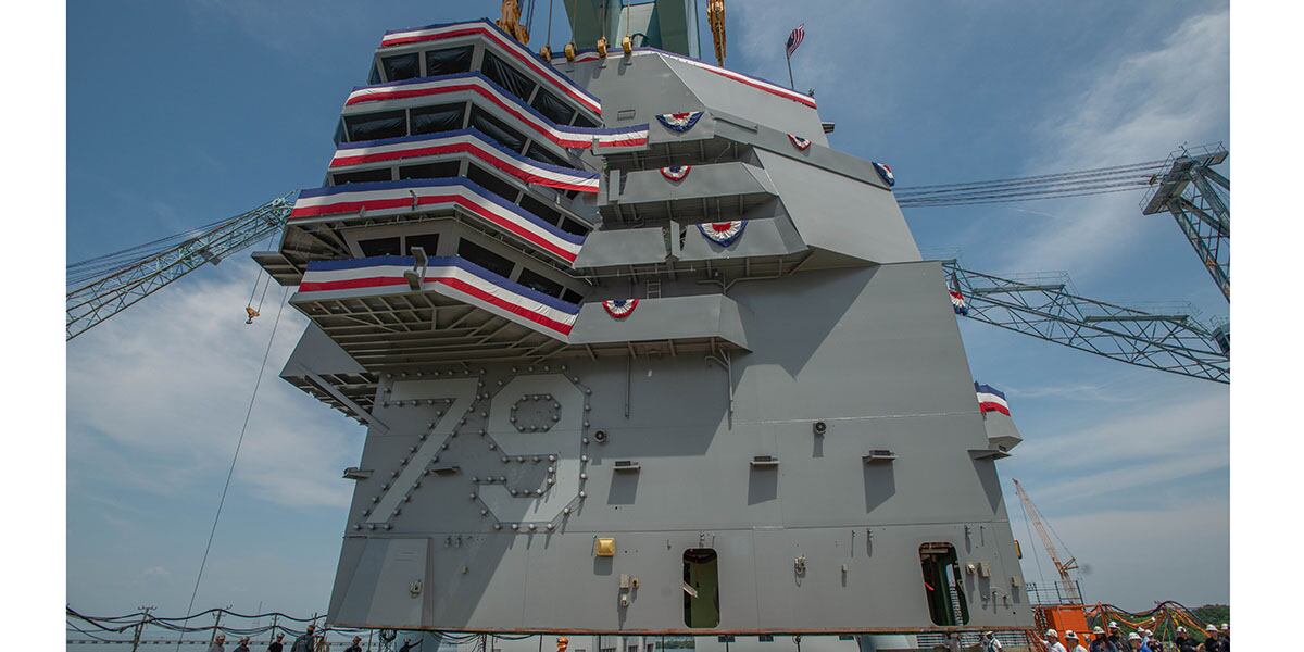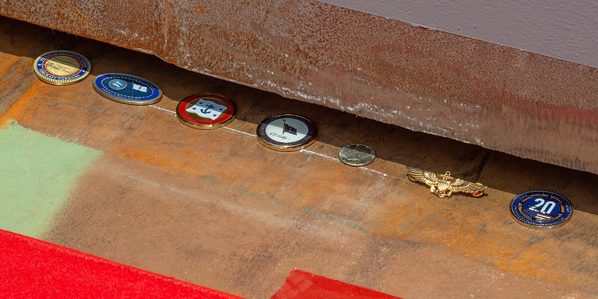 (Mark D. Faram/staff)The first keel section of the new Ford-Class carrier John F. Kennedy is put into dry dock 12 at Huntington Ingalls Newport News Shipyard on Aug. 22, 2015. (Mark D. Faram/staff)A superlift puts in place the final stern section containing the ship's rudder posts of the second Ford-Class aircraft carrier John F. Kennedy on June 22, 2017.(Mark D. Faram/Staff)Shipyard workers weld the final stern section of the aircraft carrier John F. Kennedy after a super lift put the piece in place, June 22, 2017. (Mark D. Faram/staff)Capt. Todd "Cherry" Marzano, prospective commanding officer of the new Ford-Class carrier John F. Kennedy. (Mark D. Faram/staff)The gold aviator's wings of Capt. Todd "Cherry" Marzano and a silver Kennedy half-dollar are among the items in place before the island is placed and welded in place over them. (Mark D. Faram/staff)The island of of the new Ford-Class carrier John F. Kennedy hovers over the flight deck before being lowered and welded in place. (Mark D. Faram/staff)