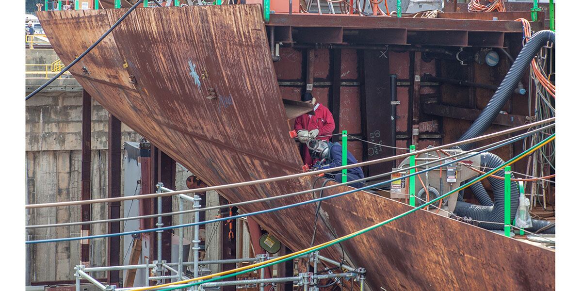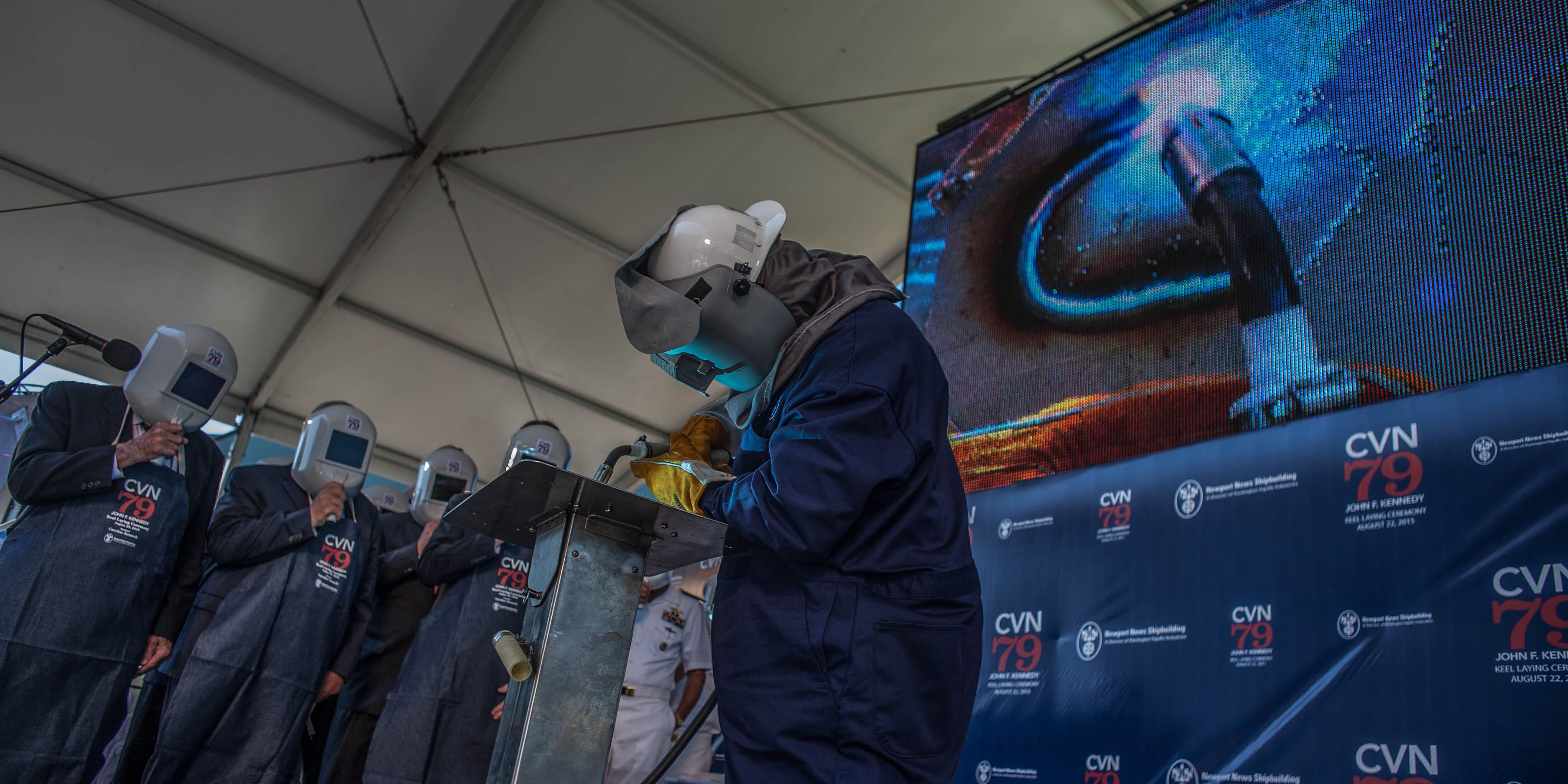 Huntington Ingalls welder Leon Walston places a weld bead over the initials of Caroline Bouvier Kennedy, daughter of the late President John F. Kennedy and the sponsor of the US navy’s next — and second Ford Class aircraft carrier. The ceremony was held at the Newport News, Va. shipyard, adjacent to Dry Dock 12.