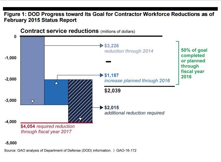 Furthermore, DoD's 2016 budget includes an increase in spending on contractors, which will only make it more difficult to make up the other half of the congressional mandate with only one more fiscal year to hit the mark, currently estimated to be about $4.1 billion.