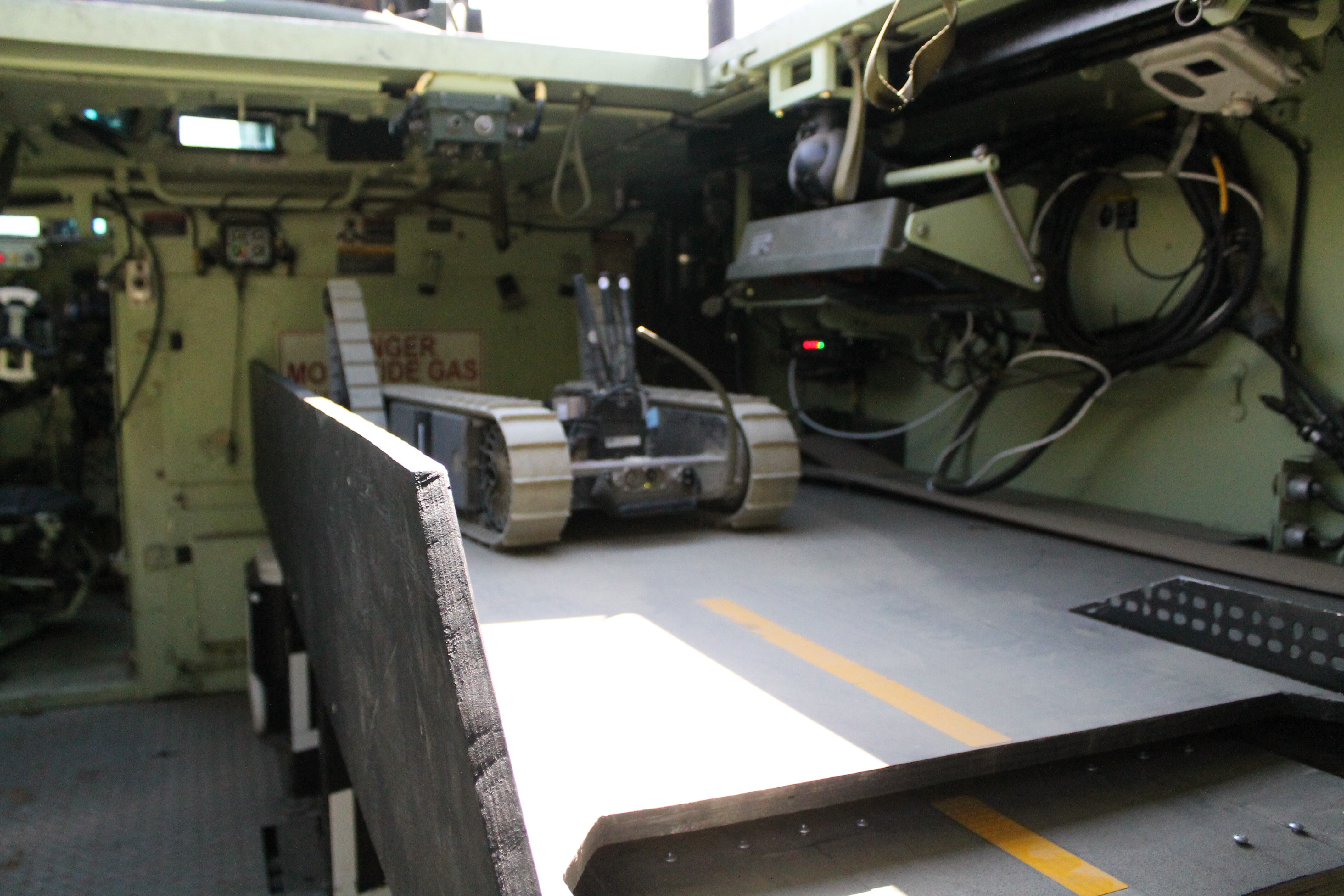The Packbot “in a marsupial sense” then returns to the vehicle, climbing up the ramp and back into a shelf inside.