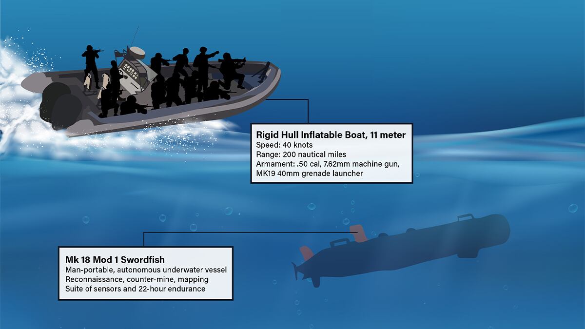 As with the MUX, the Corps is looking at ways to include electronic warfare capabilities in its plans. That allows for robotic systems to spoof enemy sensors, making them think that a small pod of four rigid-hull inflatable boats appear to be a larger flotilla of amphib ships.