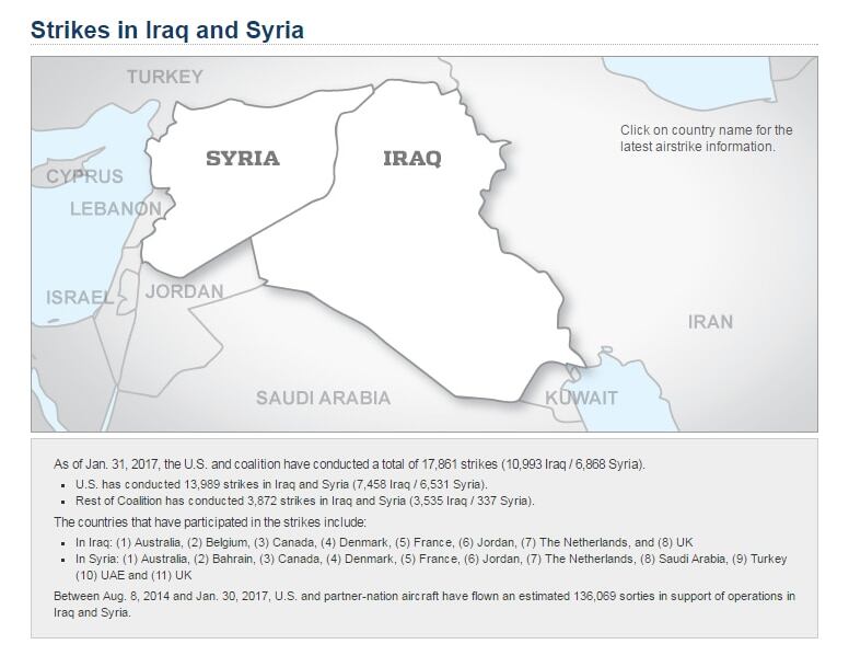 In this screen grab of the Defense Department's website, taken Saturday, Feb. 4, officials have tallied 17,861 coalition airstrikes through Jan. 31. That's nearly 5,900 fewer than the Air Force's tally through the end of December 2016.